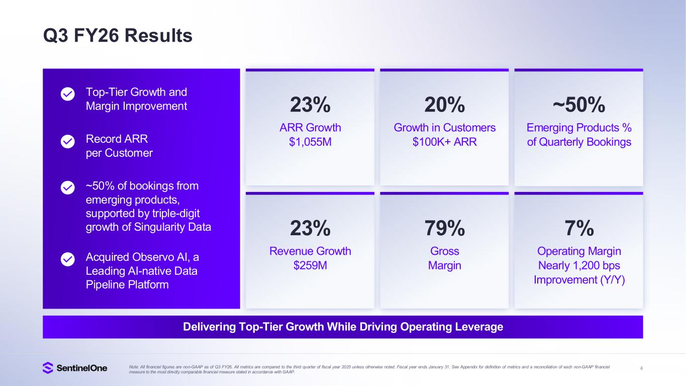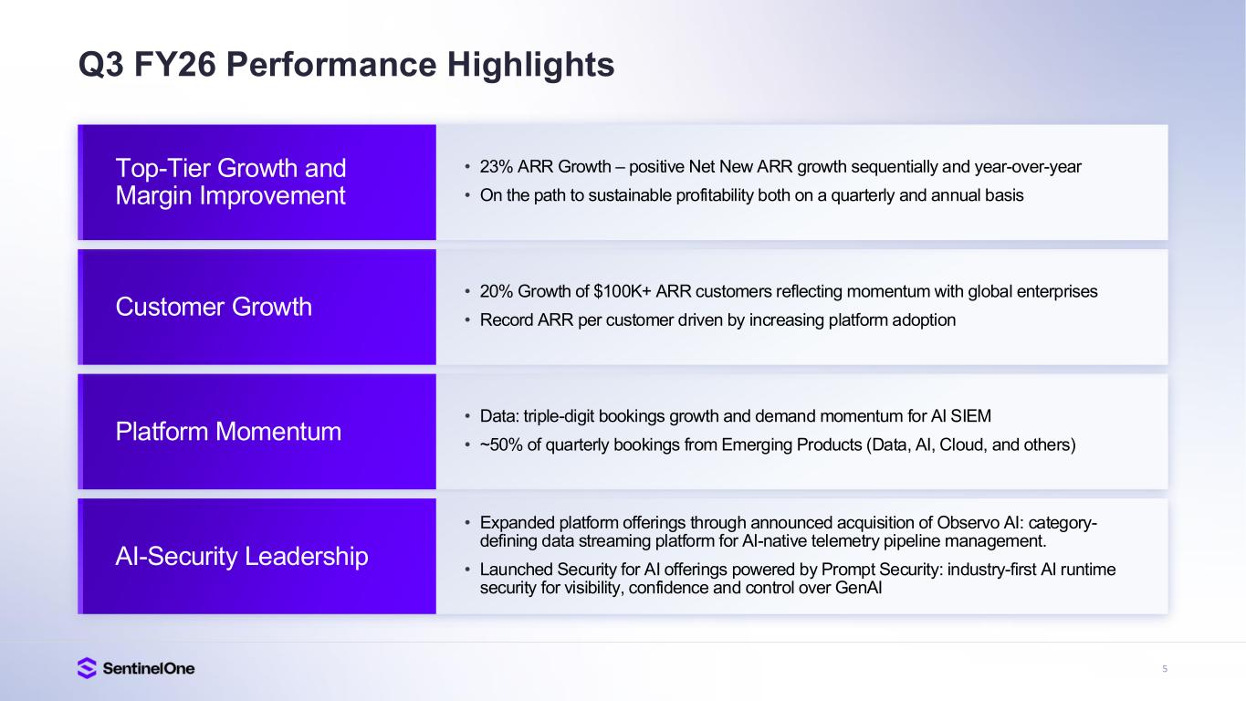 4 Q3 FY26 Results Note: All financial figures are non-GAAP as of Q3 FY26. All metrics are compared to the third quarter of fiscal year 2025 unless otherwise noted. Fiscal year ends January 31. See Appendix for definition of metrics and a reconciliation of each non-GAAP financial measure to the most directly comparable financial measure stated in accordance with GAAP. 23% ARR Growth $1,055M 20% Growth in Customers $100K+ ARR ~50% Emerging Products % of Quarterly Bookings 79% Gross Margin 7% Operating Margin Nearly 1,200 bps Improvement (Y/Y) Top-Tier Growth and Margin Improvement Record ARR per Customer ~50% of bookings from emerging products, supported by triple-digit growth of Singularity Data Acquired Observo AI, a Leading AI-native Data Pipeline Platform Delivering Top-Tier Growth While Driving Operating Leverage 23% Revenue Growth $259M