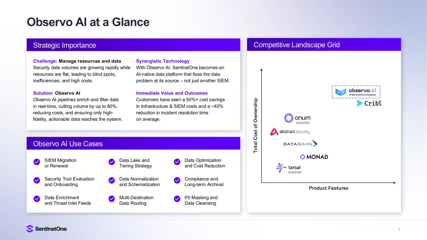6 Observo AI at a Glance Challenge: Manage resources and data Security data volumes are growing rapidly while resources are flat, leading to blind spots, inefficiencies, and high costs. Solution: Observo AI Observo AI pipelines enrich and filter data in real-time, cutting volume by up to 80%, reducing costs, and ensuring only high- fidelity, actionable data reaches the system. Synergistic Technology With Observo AI, SentinelOne becomes an AI-native data platform that fixes the data problem at its source – not just another SIEM. Immediate Value and Outcomes Customers have seen a 50%+ cost savings in Infrastructure & SIEM costs and a ~40% reduction in incident resolution time on average. Strategic Importance Observo AI Use Cases Competitive Landscape Grid SIEM Migration or Renewal Security Tool Evaluation and Onboarding Data Enrichment and Threat Intel Feeds Data Lake and Tiering Strategy Data Normalization and Schematization Multi-Destination Data Routing Data Optimization and Cost Reduction Compliance and Long-term Archival PII Masking and Data Cleansing acquired acquired