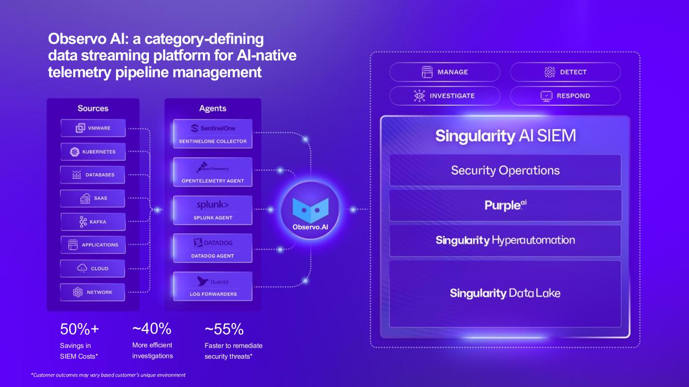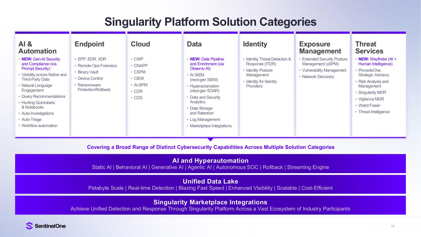 14 Singularity Platform Solution Categories AI & Automation • EPP, EDR, XDR • Remote Ops Forensics • Binary Vault • Device Control • Ransomware Protection/Rollback Endpoint • CWP • CNAPP • CSPM • CIEM • AI-SPM • CDR • CDS Cloud • NEW: Data Pipeline and Enrichment (via Observo AI) • AI SIEM (next-gen SIEM) • Hyperautomation (next-gen SOAR) • Data and Security Analytics • Data Storage and Retention • Log Management • Marketplace Integrations Data • Identity Threat Detection & Response (ITDR) • Identity Posture Management • Identity for Identity Providers Identity • Extended Security Posture Management (xSPM) • Vulnerability Management • Network Discovery Exposure Management • NEW: Wayfinder (AI + Human Intelligence) • PinnacleOne: Strategic Advisory • Risk Analysis and Management • Singularity MDR • Vigilance MDR • WatchTower • Threat Intelligence Threat Services AI and Hyperautomation Covering a Broad Range of Distinct Cybersecurity Capabilities Across Multiple Solution Categories Unified Data Lake Singularity Marketplace Integrations • NEW: Gen-AI Security and Compliance (via Prompt Security) • Visibility across Native and Third-Party Data • Natural Language Engagement • Query Recommendations • Hunting Quickstarts & Notebooks • Auto-Investigations • Auto-Triage • Workflow automation