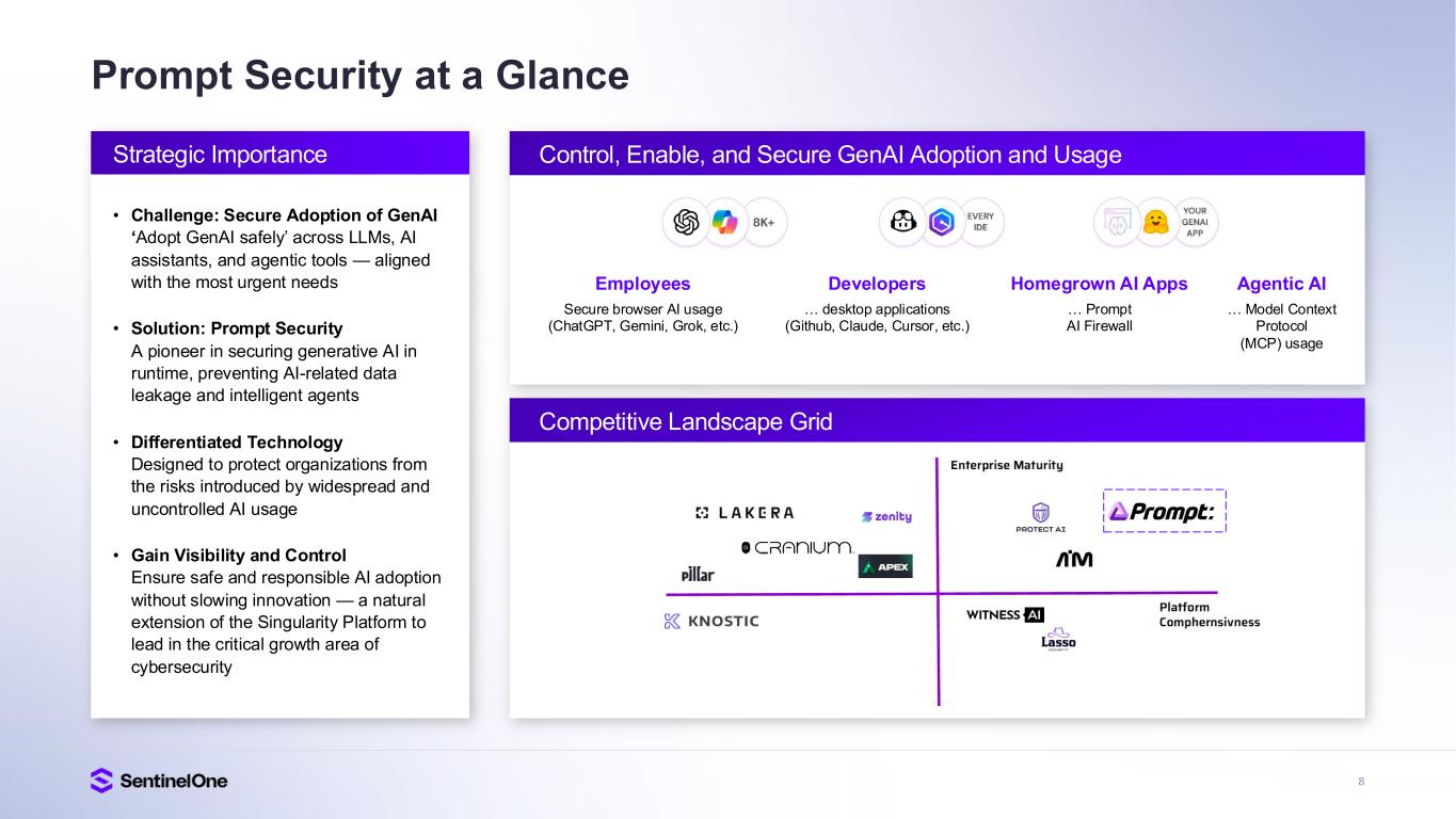 8 Prompt Security at a Glance • Challenge: Secure Adoption of GenAI ‘Adopt GenAI safely’ across LLMs, AI assistants, and agentic tools — aligned with the most urgent needs • Solution: Prompt Security A pioneer in securing generative AI in runtime, preventing AI-related data leakage and intelligent agents • Differentiated Technology Designed to protect organizations from the risks introduced by widespread and uncontrolled AI usage • Gain Visibility and Control Ensure safe and responsible AI adoption without slowing innovation — a natural extension of the Singularity Platform to lead in the critical growth area of cybersecurity Strategic Importance Control, Enable, and Secure GenAI Adoption and Usage Competitive Landscape Grid Employees Secure browser AI usage (ChatGPT, Gemini, Grok, etc.) Developers … desktop applications (Github, Claude, Cursor, etc.) Homegrown AI Apps … Prompt AI Firewall Agentic AI … Model Context Protocol (MCP) usage