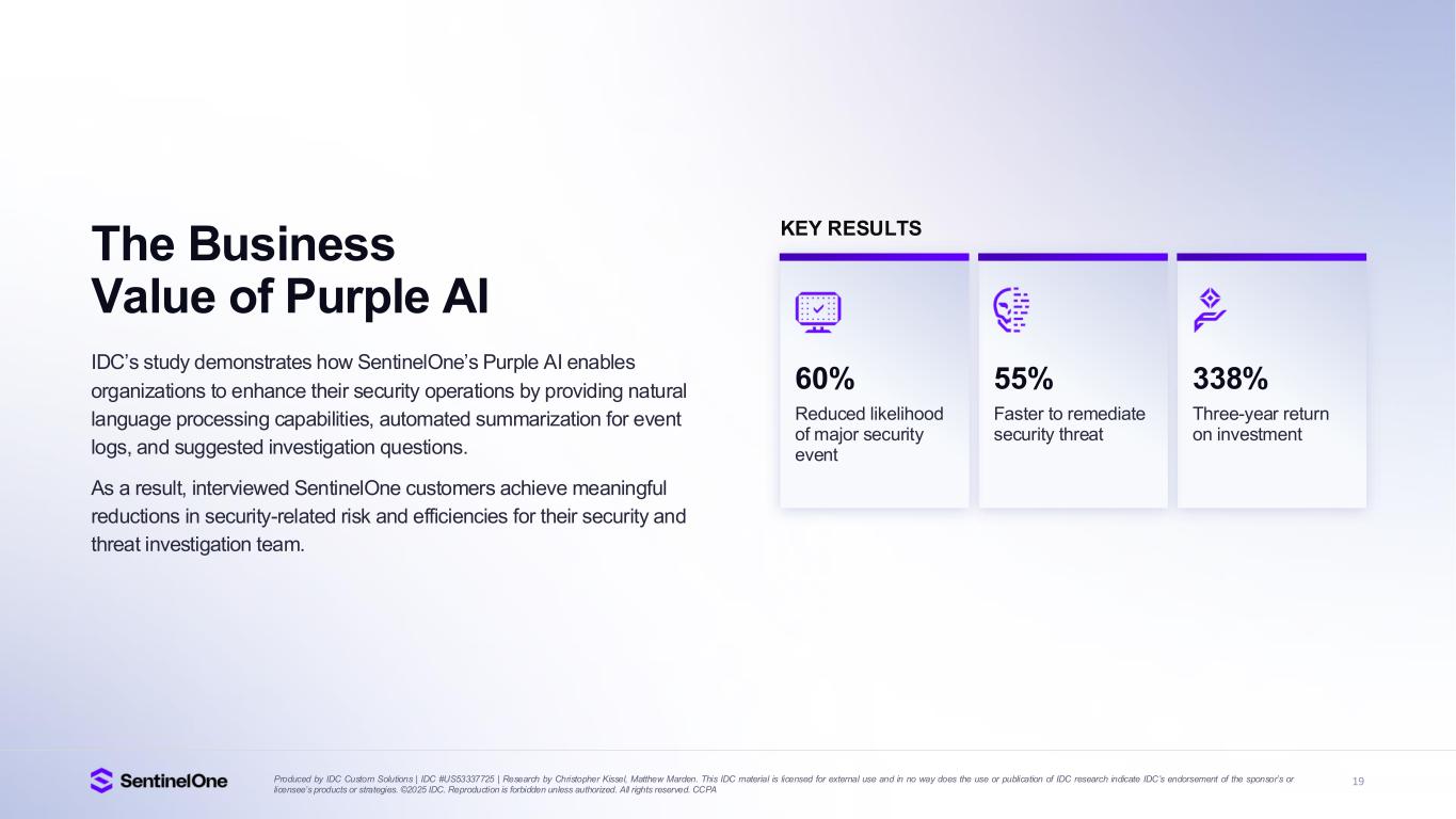 19Produced by IDC Custom Solutions | IDC #US53337725 | Research by Christopher Kissel, Matthew Marden. This IDC material is licensed for external use and in no way does the use or publication of IDC research indicate IDC’s endorsement of the sponsor’s or licensee’s products or strategies. ©2025 IDC. Reproduction is forbidden unless authorized. All rights reserved. CCPA The Business Value of Purple AI IDC’s study demonstrates how SentinelOne’s Purple AI enables organizations to enhance their security operations by providing natural language processing capabilities, automated summarization for event logs, and suggested investigation questions. As a result, interviewed SentinelOne customers achieve meaningful reductions in security-related risk and efficiencies for their security and threat investigation team. 338% Three-year return on investment 55% Faster to remediate security threat KEY RESULTS 60% Reduced likelihood of major security event