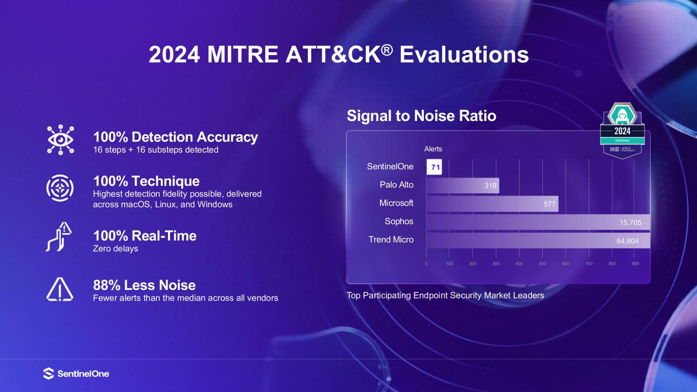 20 Top Participating Endpoint Security Market Leaders Signal to Noise Ratio Alerts SentinelOne Palo Alto Microsoft Sophos Trend Micro 0 100 200 300 400 500 600 700 800 900 71 319 577 15,705 64,804 100% Detection Accuracy 16 steps + 16 substeps detected 100% Technique Highest detection fidelity possible, delivered across macOS, Linux, and Windows 100% Real-Time Zero delays 88% Less Noise Fewer alerts than the median across all vendors 2024 MITRE ATT&CK® Evaluations