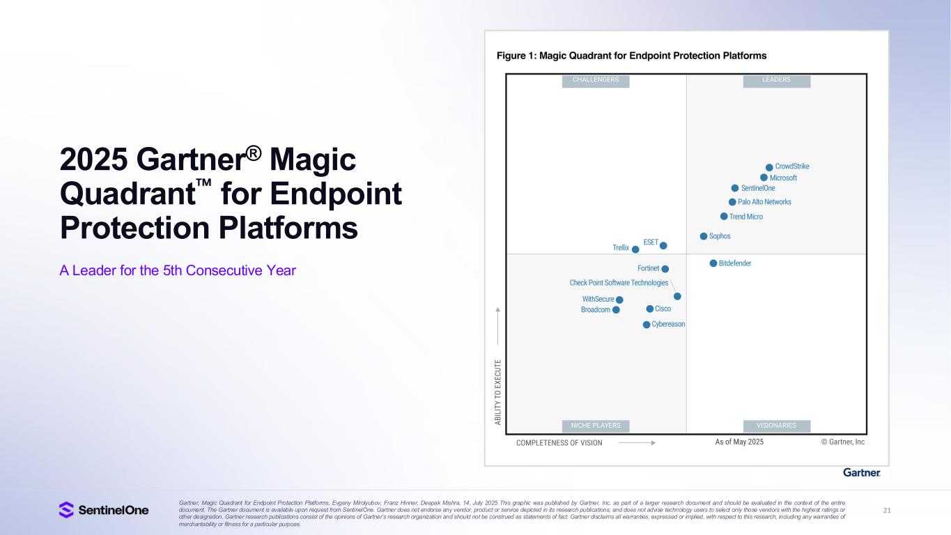21 2025 Gartner® Magic Quadrant for Endpoint Protection Platforms A Leader for the 5th Consecutive Year Gartner, Magic Quadrant for Endpoint Protection Platforms, Evgeny Mirolyubov, Franz Hinner, Deepak Mishra, 14, July 2025 This graphic was published by Gartner, Inc. as part of a larger research document and should be evaluated in the context of the entire document. The Gartner document is available upon request from SentinelOne. Gartner does not endorse any vendor, product or service depicted in its research publications, and does not advise technology users to select only those vendors with the highest ratings or other designation. Gartner research publications consist of the opinions of Gartner’s research organization and should not be construed as statements of fact. Gartner disclaims all warranties, expressed or implied, with respect to this research, including any warranties of merchantability or fitness for a particular purpose.