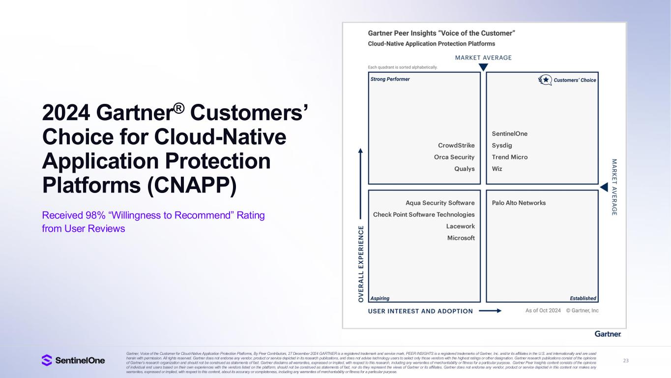 18 Leader G2 Grid® for Cloud-Native Application Protection Platform (CNAPP), Highest Rated 4.9 out of 5 FedRAMP High Authorized for Endpoint, AI-SIEM, Purple AI, CNAPP, and Hyperautomation A Leader in Frost Radar A Growth and Innovation Leader in 2025 Frost & Sullivan Radar for Endpoint, MDR and CWPP A Leader in the 2025 Gartner® Magic Quadrant for Endpoint Protection Platforms for 5th consecutive year Enterprise Evaluation 100% Protection & Detection, and Zero Delays or Configuration Changes 95%+ Would Recommend SentinelOne Trusted and Industry Proven Gartner® Peer Insights: EPP (based on 480 reviews, 95%, as of Apr 2024) MDR (based on 214 reviews, 95%, as of Sep 2024) CNAPP (based on 201 reviews, 98%, as of Oct 2024). Gartner®, Magic Quadrant for Endpoint Protection Platforms, Evgeny Mirolyubov et al., 23 September 2024. Gartner®, Peer Insights , Voice of the Customer for Managed Detection and Response, Peer Contributors, 28 November 2024. Gartner®, Peer Insights , Voice of the Customer for Endpoint Protection Platforms, Peer Contributors, 28 June 2024. Gartner®, Peer Insights , Voice of the Customer for Cloud-Native Application Protection Platforms, Peer Contributors, 27 December 2024 GARTNER is a registered trademark and service mark of Gartner, Inc. and/or its affiliates in the U.S. and internationally, and MAGIC QUADRANT and PEER INSIGHTS is a registered trademark of Gartner, Inc. and/or its affiliates and are used herein with permission. All rights reserved. Gartner does not endorse any vendor, product or service depicted in its research publications, and does not advise technology users to select only those vendors with the highest ratings or other designation. Gartner research publications consist of the opinions of Gartner’s research organization and should not be construed as statements of fact. Gartner disclaims all warranties, expressed or implied, with respect to this research, including any warranties of merchantability or fitness for a particular purpose. Gartner Peer Insights content consists of the opinions of individual end users based on their own experiences, and should not be construed as statements of fact, nor do they represent the views of Gartner or its affiliates. Gartner does not endorse any vendor, product or service depicted in this content nor makes any warranties, expressed or implied, with respect to this content, about its accuracy or completeness, including any warranties of merchantability or fitness for a particular purpose. The Gartner content described herein (the “Gartner Content”) represents research opinion or viewpoints published, as part of a syndicated subscription service, by Gartner, Inc. ("Gartner"), and is not a representation of fact. Gartner Content speaks as of its original publication date (and not as of the date of this Earnings Presentation), and the opinions expressed in the Gartner Content are subject to change without notice. Gartner® Peer Insights Voice of the Customer Customer’s Choice XDR (based on 144 reviews, 97%, Jan 2025) CNAPP (based on 201 reviews, 98%, Oct 2024) MDR (based on 214 reviews, 95%, Sep 2024)