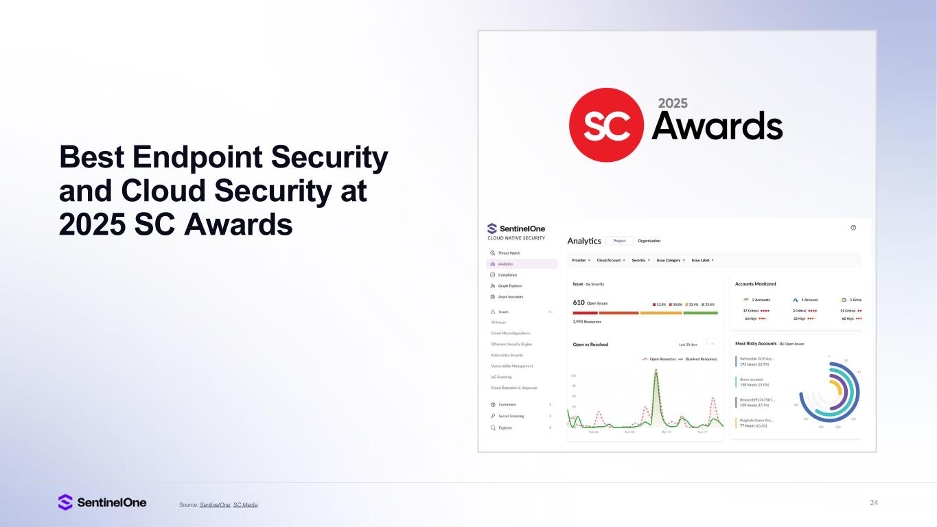 24Source: SentinelOne, SC Media Best Endpoint Security and Cloud Security at 2025 SC Awards
