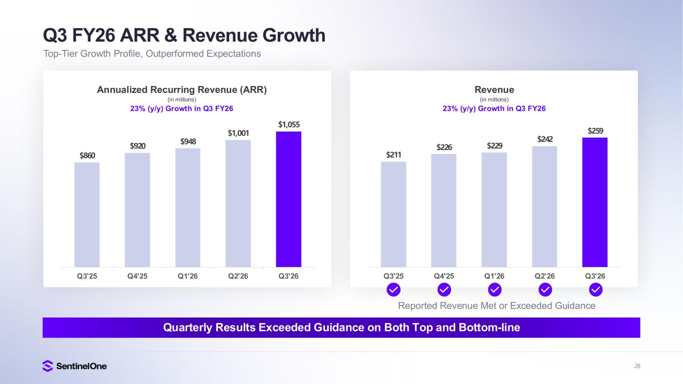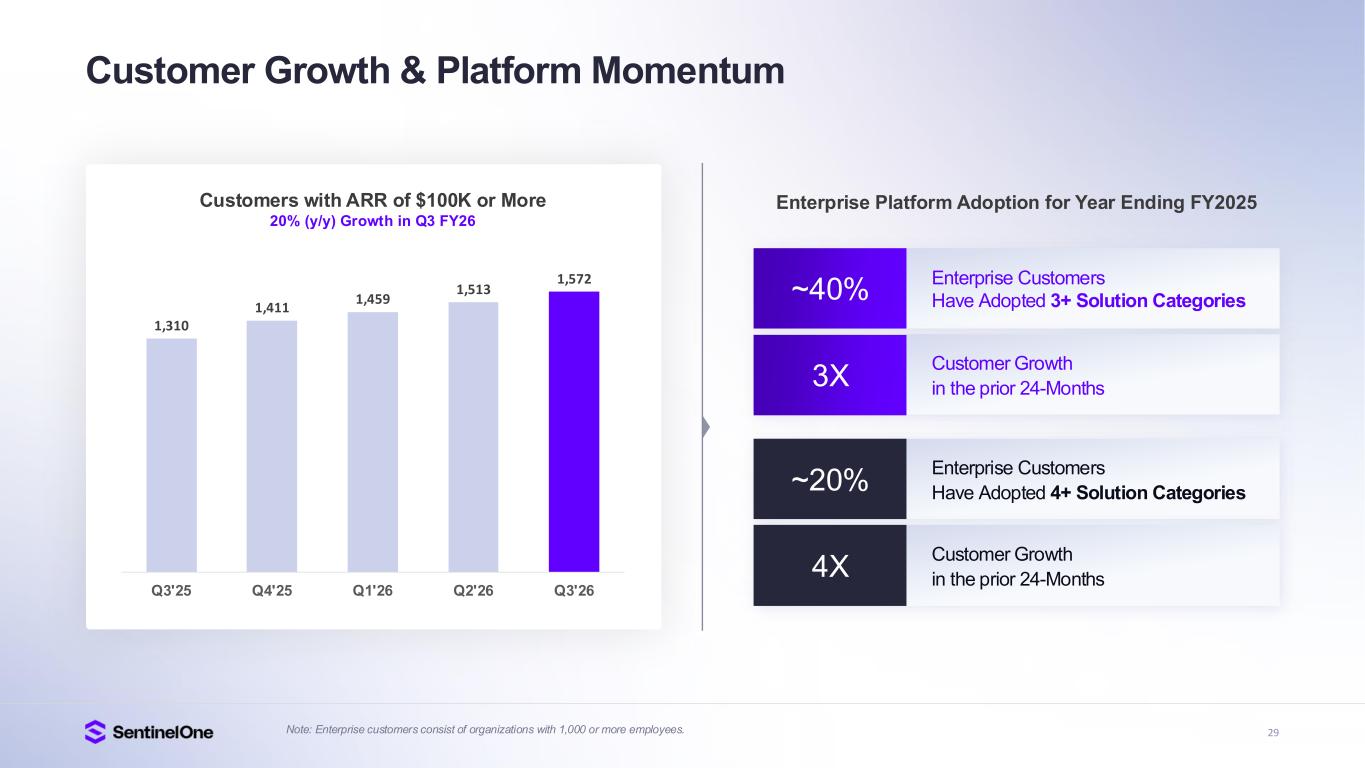 28 $211 $226 $229 $242 $259 $- $50 $10 $150 $20 $250 $30 Q3'25 Q4'25 Q1'26 Q2'26 Q3'26 $860 $920 $948 $1,001 $1,055 $20 $30 $40 $50 $60 $70 $80 $90 $1,00 $1,10 Q3'25 Q4'25 Q1'26 Q2'26 Q3'26 Q3 FY26 ARR & Revenue Growth Annualized Recurring Revenue (ARR) (in millions) 23% (y/y) Growth in Q3 FY26 Revenue (in millions) 23% (y/y) Growth in Q3 FY26 Quarterly Results Exceeded Guidance on Both Top and Bottom-line Top-Tier Growth Profile, Outperformed Expectations Reported Revenue Met or Exceeded Guidance
