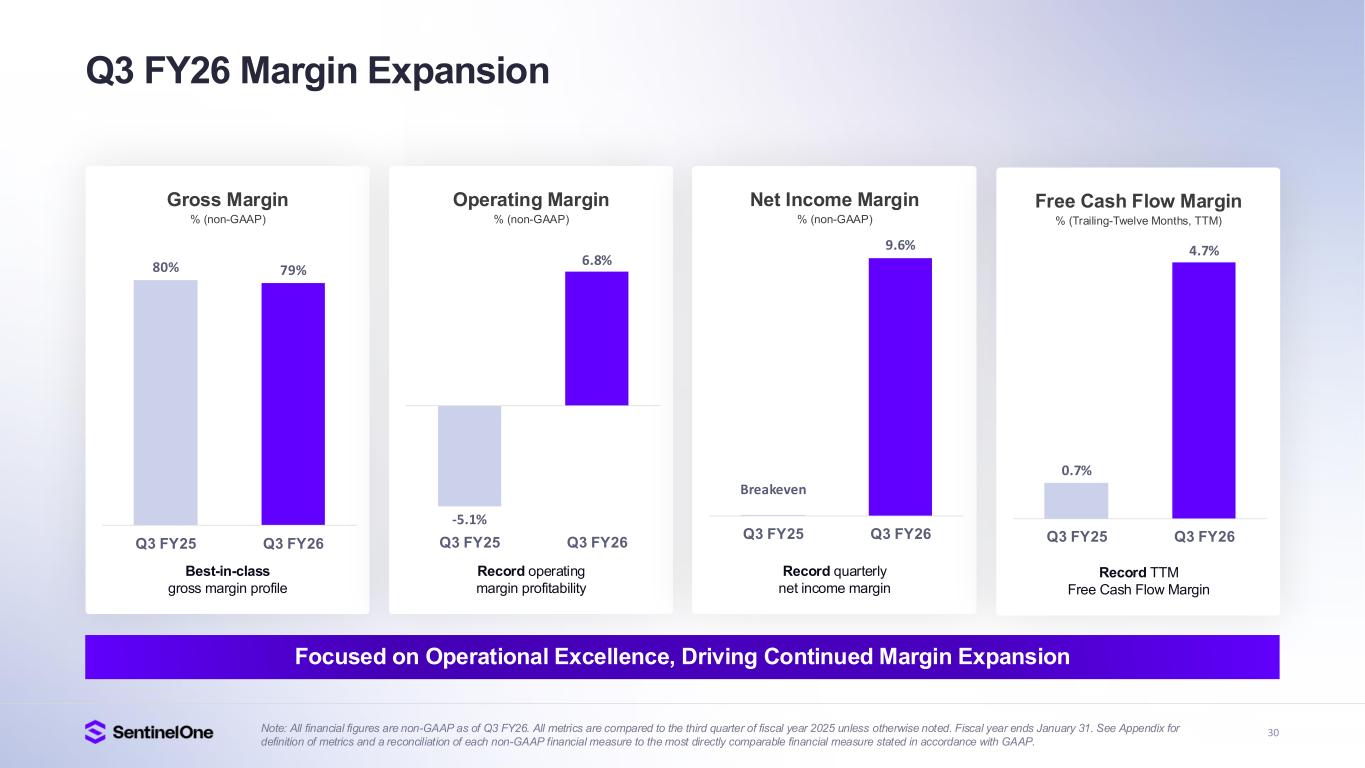 29 Enterprise Customers Have Adopted 4+ Solution Categories Customer Growth in the prior 24-Months Enterprise Customers Have Adopted 3+ Solution Categories Customer Growth in the prior 24-Months 1,310 1,411 1,459 1,513 1,572 0 20 40 60 80 100 1200 1400 1600 Q3'25 Q4'25 Q1'26 Q2'26 Q3'26 Customers with ARR of $100K or More 20% (y/y) Growth in Q3 FY26 Customer Growth & Platform Momentum Note: Enterprise customers consist of organizations with 1,000 or more employees. Enterprise Platform Adoption for Year Ending FY2025 ~40% 3X ~20% 4X
