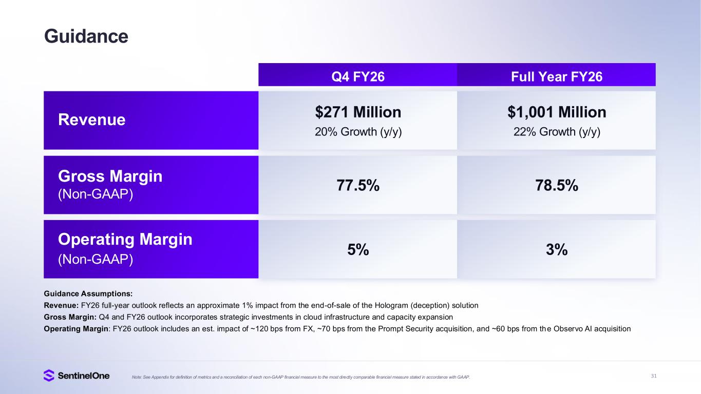 31 Guidance Guidance Assumptions: Revenue: FY26 full-year outlook reflects an approximate 1% impact from the end-of-sale of the Hologram (deception) solution Gross Margin: Q4 and FY26 outlook incorporates strategic investments in cloud infrastructure and capacity expansion Operating Margin: FY26 outlook includes an est. impact of ~120 bps from FX, ~70 bps from the Prompt Security acquisition, and ~60 bps from the Observo AI acquisition Q4 FY26 Full Year FY26 $1,001 Million 22% Growth (y/y) 78.5% 3% $271 Million 20% Growth (y/y) 77.5% 5% Revenue Gross Margin (Non-GAAP) Operating Margin (Non-GAAP) Note: See Appendix for definition of metrics and a reconciliation of each non-GAAP financial measure to the most directly comparable financial measure stated in accordance with GAAP.