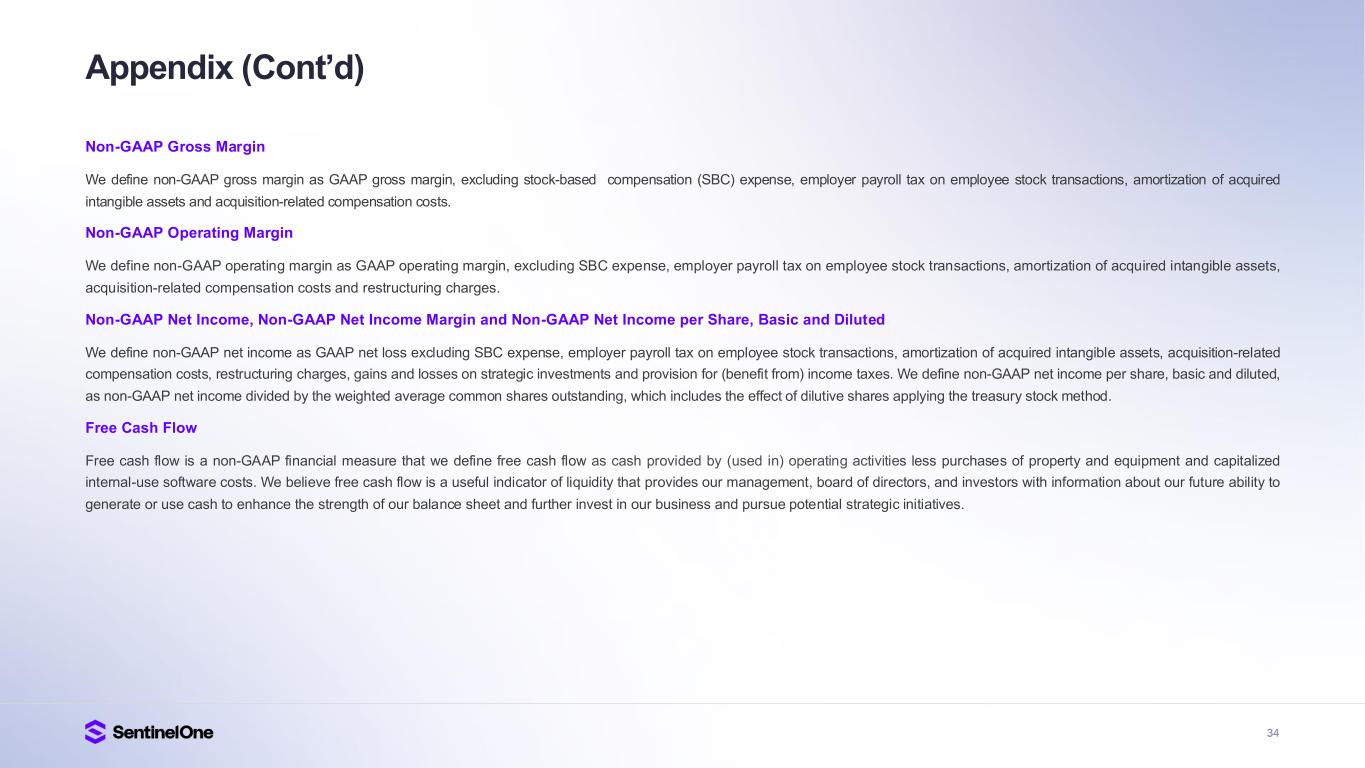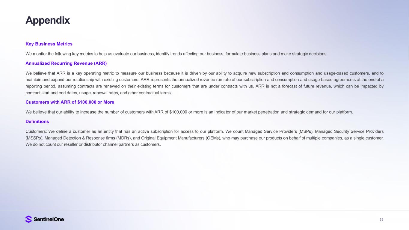 33 Appendix Key Business Metrics We monitor the following key metrics to help us evaluate our business, identify trends affecting our business, formulate business plans and make strategic decisions. Annualized Recurring Revenue (ARR) We believe that ARR is a key operating metric to measure our business because it is driven by our ability to acquire new subscription and consumption and usage-based customers, and to maintain and expand our relationship with existing customers. ARR represents the annualized revenue run rate of our subscription and consumption and usage-based agreements at the end of a reporting period, assuming contracts are renewed on their existing terms for customers that are under contracts with us. ARR is not a forecast of future revenue, which can be impacted by contract start and end dates, usage, renewal rates, and other contractual terms. Customers with ARR of $100,000 or More We believe that our ability to increase the number of customers with ARR of $100,000 or more is an indicator of our market penetration and strategic demand for our platform. Definitions Customers: We define a customer as an entity that has an active subscription for access to our platform. We count Managed Service Providers (MSPs), Managed Security Service Providers (MSSPs), Managed Detection & Response firms (MDRs), and Original Equipment Manufacturers (OEMs), who may purchase our products on behalf of multiple companies, as a single customer. We do not count our reseller or distributor channel partners as customers.