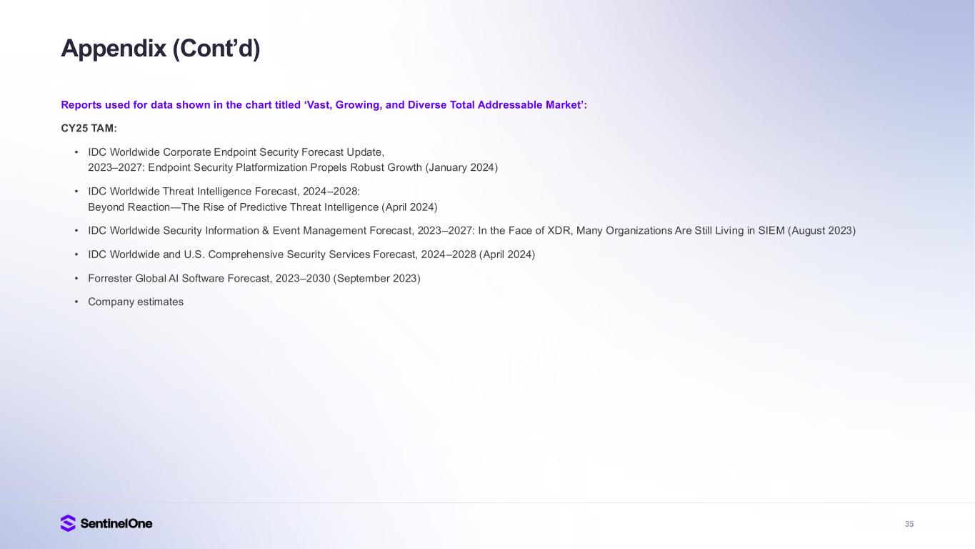 35 Appendix (Cont’d) Reports used for data shown in the chart titled ‘Vast, Growing, and Diverse Total Addressable Market’: CY25 TAM: • IDC Worldwide Corporate Endpoint Security Forecast Update, 2023–2027: Endpoint Security Platformization Propels Robust Growth (January 2024) • IDC Worldwide Threat Intelligence Forecast, 2024–2028: Beyond Reaction—The Rise of Predictive Threat Intelligence (April 2024) • IDC Worldwide Security Information & Event Management Forecast, 2023–2027: In the Face of XDR, Many Organizations Are Still Living in SIEM (August 2023) • IDC Worldwide and U.S. Comprehensive Security Services Forecast, 2024–2028 (April 2024) • Forrester Global AI Software Forecast, 2023–2030 (September 2023) • Company estimates
