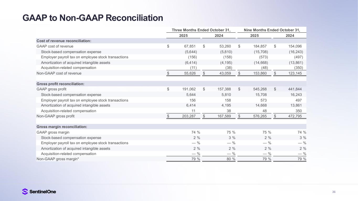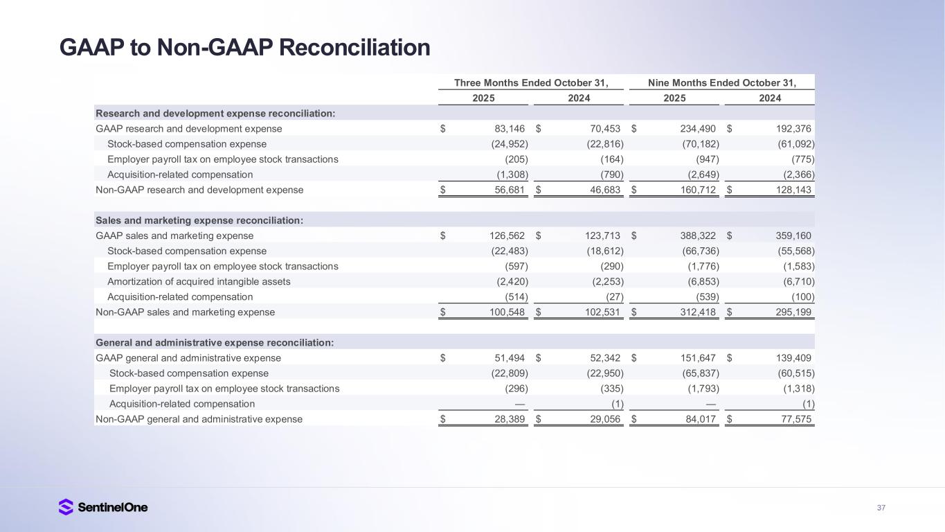 36 GAAP to Non-GAAP Reconciliation Three Months Ended October 31, Nine Months Ended October 31, 2025 2024 2025 2024 Cost of revenue reconciliation: GAAP cost of revenue $ 67,851 $ 53,260 $ 184,857 $ 154,096 Stock-based compensation expense (5,644) (5,810) (15,708) (16,243) Employer payroll tax on employee stock transactions (156) (158) (573) (497) Amortization of acquired intangible assets (6,414) (4,195) (14,668) (13,861) Acquisition-related compensation (11) (38) (48) (350) Non-GAAP cost of revenue $ 55,626 $ 43,059 $ 153,860 $ 123,145 Gross profit reconciliation: GAAP gross profit $ 191,062 $ 157,388 $ 545,268 $ 441,844 Stock-based compensation expense 5,644 5,810 15,708 16,243 Employer payroll tax on employee stock transactions 156 158 573 497 Amortization of acquired intangible assets 6,414 4,195 14,668 13,861 Acquisition-related compensation 11 38 48 350 Non-GAAP gross profit $ 203,287 $ 167,589 $ 576,265 $ 472,795 Gross margin reconciliation: GAAP gross margin 74 % 75 % 75 % 74 % Stock-based compensation expense 2 % 3 % 2 % 3 % Employer payroll tax on employee stock transactions — % — % — % — % Amortization of acquired intangible assets 2 % 2 % 2 % 2 % Acquisition-related compensation — % — % — % — % Non-GAAP gross margin* 79 % 80 % 79 % 79 %