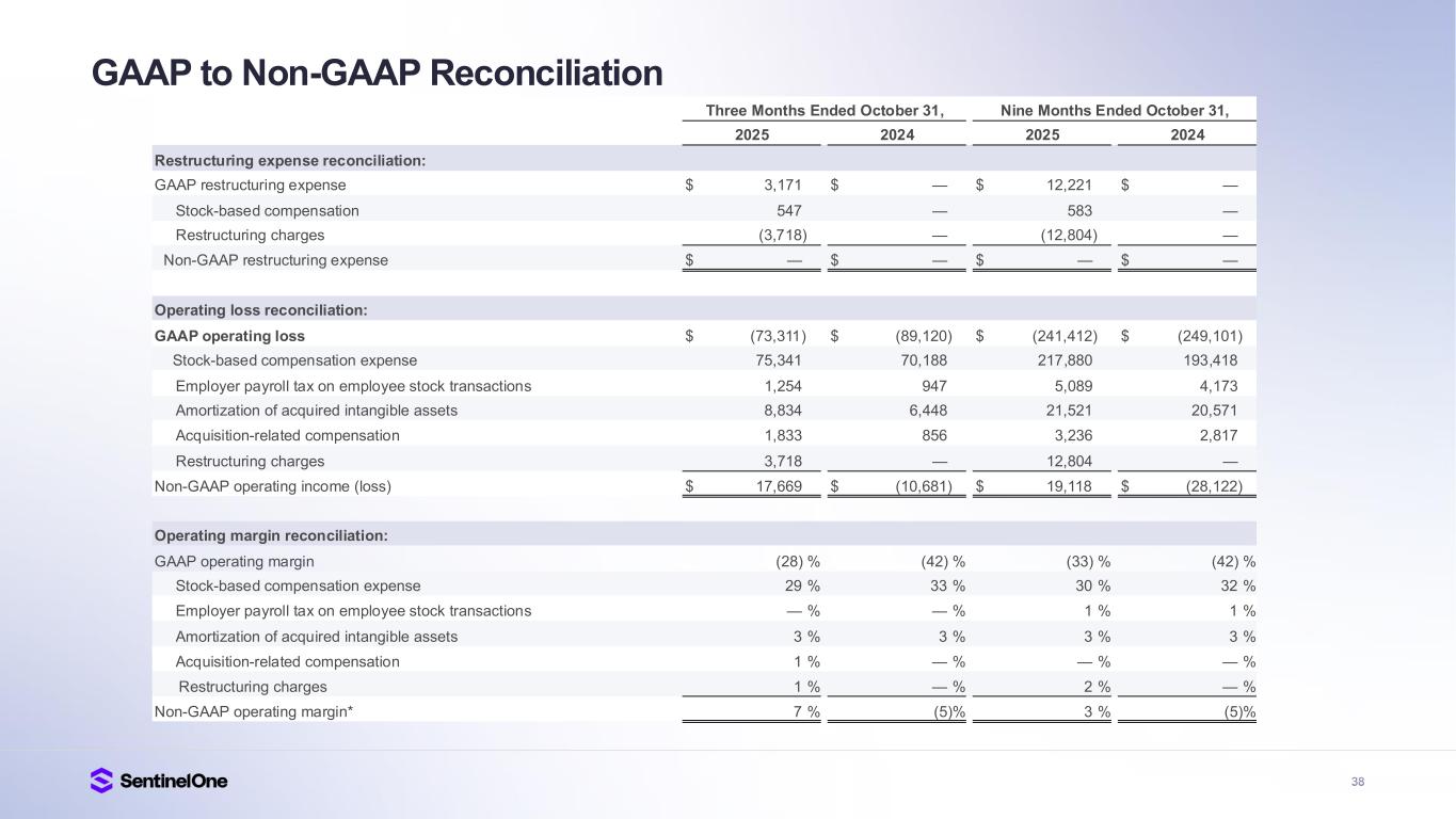 37 GAAP to Non-GAAP Reconciliation Three Months Ended October 31, Nine Months Ended October 31, 2025 2024 2025 2024 Research and development expense reconciliation: GAAP research and development expense $ 83,146 $ 70,453 $ 234,490 $ 192,376 Stock-based compensation expense (24,952) (22,816) (70,182) (61,092) Employer payroll tax on employee stock transactions (205) (164) (947) (775) Acquisition-related compensation (1,308) (790) (2,649) (2,366) Non-GAAP research and development expense $ 56,681 $ 46,683 $ 160,712 $ 128,143 Sales and marketing expense reconciliation: GAAP sales and marketing expense $ 126,562 $ 123,713 $ 388,322 $ 359,160 Stock-based compensation expense (22,483) (18,612) (66,736) (55,568) Employer payroll tax on employee stock transactions (597) (290) (1,776) (1,583) Amortization of acquired intangible assets (2,420) (2,253) (6,853) (6,710) Acquisition-related compensation (514) (27) (539) (100) Non-GAAP sales and marketing expense $ 100,548 $ 102,531 $ 312,418 $ 295,199 General and administrative expense reconciliation: GAAP general and administrative expense $ 51,494 $ 52,342 $ 151,647 $ 139,409 Stock-based compensation expense (22,809) (22,950) (65,837) (60,515) Employer payroll tax on employee stock transactions (296) (335) (1,793) (1,318) Acquisition-related compensation — (1) — (1) Non-GAAP general and administrative expense $ 28,389 $ 29,056 $ 84,017 $ 77,575