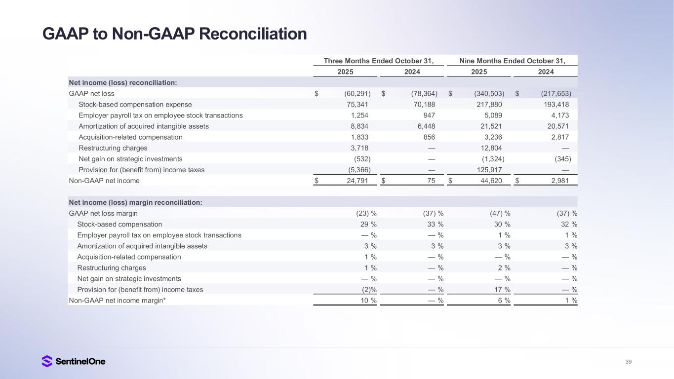 38 GAAP to Non-GAAP Reconciliation Three Months Ended October 31, Nine Months Ended October 31, 2025 2024 2025 2024 Restructuring expense reconciliation: GAAP restructuring expense $ 3,171 $ — $ 12,221 $ — Stock-based compensation 547 — 583 — Restructuring charges (3,718) — (12,804) — Non-GAAP restructuring expense $ — $ — $ — $ — Operating loss reconciliation: GAAP operating loss $ (73,311) $ (89,120) $ (241,412) $ (249,101) Stock-based compensation expense 75,341 70,188 217,880 193,418 Employer payroll tax on employee stock transactions 1,254 947 5,089 4,173 Amortization of acquired intangible assets 8,834 6,448 21,521 20,571 Acquisition-related compensation 1,833 856 3,236 2,817 Restructuring charges 3,718 — 12,804 — Non-GAAP operating income (loss) $ 17,669 $ (10,681) $ 19,118 $ (28,122) Operating margin reconciliation: GAAP operating margin (28) % (42) % (33) % (42) % Stock-based compensation expense 29 % 33 % 30 % 32 % Employer payroll tax on employee stock transactions — % — % 1 % 1 % Amortization of acquired intangible assets 3 % 3 % 3 % 3 % Acquisition-related compensation 1 % — % — % — % Restructuring charges 1 % — % 2 % — % Non-GAAP operating margin* 7 % (5)% 3 % (5)%