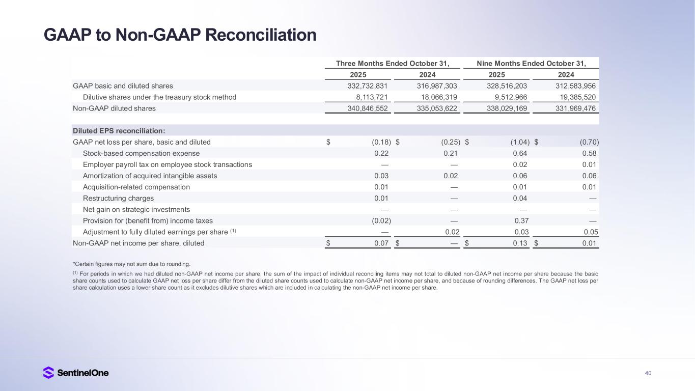 39 GAAP to Non-GAAP Reconciliation Three Months Ended October 31, Nine Months Ended October 31, 2025 2024 2025 2024 Net income (loss) reconciliation: GAAP net loss $ (60,291) $ (78,364) $ (340,503) $ (217,653) Stock-based compensation expense 75,341 70,188 217,880 193,418 Employer payroll tax on employee stock transactions 1,254 947 5,089 4,173 Amortization of acquired intangible assets 8,834 6,448 21,521 20,571 Acquisition-related compensation 1,833 856 3,236 2,817 Restructuring charges 3,718 — 12,804 — Net gain on strategic investments (532) — (1,324) (345) Provision for (benefit from) income taxes (5,366) — 125,917 — Non-GAAP net income $ 24,791 $ 75 $ 44,620 $ 2,981 Net income (loss) margin reconciliation: GAAP net loss margin (23) % (37) % (47) % (37) % Stock-based compensation 29 % 33 % 30 % 32 % Employer payroll tax on employee stock transactions — % — % 1 % 1 % Amortization of acquired intangible assets 3 % 3 % 3 % 3 % Acquisition-related compensation 1 % — % — % — % Restructuring charges 1 % — % 2 % — % Net gain on strategic investments — % — % — % — % Provision for (benefit from) income taxes (2)% — % 17 % — % Non-GAAP net income margin* 10 % — % 6 % 1 %