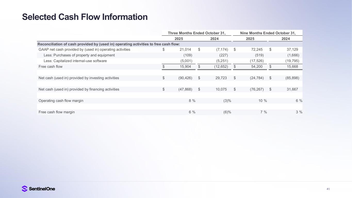 41 Selected Cash Flow Information Three Months Ended October 31, Nine Months Ended October 31, 2025 2024 2025 2024 Reconciliation of cash provided by (used in) operating activities to free cash flow: GAAP net cash provided by (used in) operating activities $ 21,014 $ (7,174) $ 72,245 $ 37,129 Less: Purchases of property and equipment (109) (227) (519) (1,666) Less: Capitalized internal-use software (5,001) (5,251) (17,526) (19,795) Free cash flow $ 15,904 $ (12,652) $ 54,200 $ 15,668 Net cash (used in) provided by investing activities $ (90,426) $ 29,723 $ (24,784) $ (85,898) Net cash (used in) provided by financing activities $ (47,868) $ 10,075 $ (76,267) $ 31,667 Operating cash flow margin 8 % (3)% 10 % 6 % Free cash flow margin 6 % (6)% 7 % 3 %