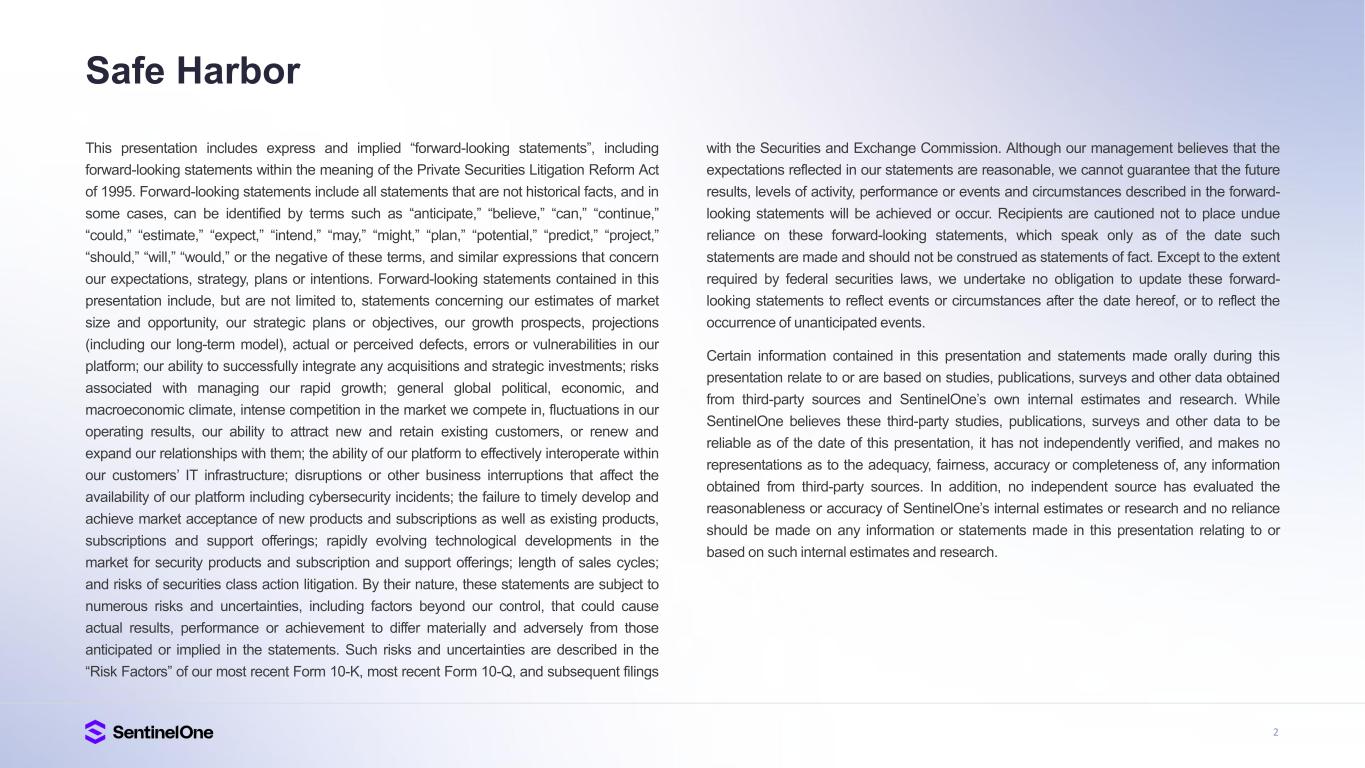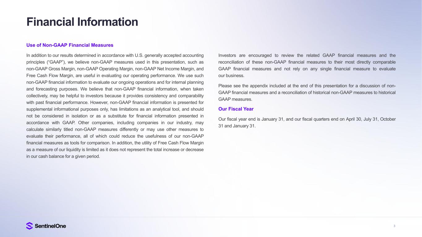 2 Safe Harbor This presentation includes express and implied “forward-looking statements”, including forward-looking statements within the meaning of the Private Securities Litigation Reform Act of 1995. Forward-looking statements include all statements that are not historical facts, and in some cases, can be identified by terms such as “anticipate,” “believe,” “can,” “continue,” “could,” “estimate,” “expect,” “intend,” “may,” “might,” “plan,” “potential,” “predict,” “project,” “should,” “will,” “would,” or the negative of these terms, and similar expressions that concern our expectations, strategy, plans or intentions. Forward-looking statements contained in this presentation include, but are not limited to, statements concerning our estimates of market size and opportunity, our strategic plans or objectives, our growth prospects, projections (including our long-term model), actual or perceived defects, errors or vulnerabilities in our platform; our ability to successfully integrate any acquisitions and strategic investments; risks associated with managing our rapid growth; general global political, economic, and macroeconomic climate, intense competition in the market we compete in, fluctuations in our operating results, our ability to attract new and retain existing customers, or renew and expand our relationships with them; the ability of our platform to effectively interoperate within our customers’ IT infrastructure; disruptions or other business interruptions that affect the availability of our platform including cybersecurity incidents; the failure to timely develop and achieve market acceptance of new products and subscriptions as well as existing products, subscriptions and support offerings; rapidly evolving technological developments in the market for security products and subscription and support offerings; length of sales cycles; and risks of securities class action litigation. By their nature, these statements are subject to numerous risks and uncertainties, including factors beyond our control, that could cause actual results, performance or achievement to differ materially and adversely from those anticipated or implied in the statements. Such risks and uncertainties are described in the “Risk Factors” of our most recent Form 10-K, most recent Form 10-Q, and subsequent filings with the Securities and Exchange Commission. Although our management believes that the expectations reflected in our statements are reasonable, we cannot guarantee that the future results, levels of activity, performance or events and circumstances described in the forward- looking statements will be achieved or occur. Recipients are cautioned not to place undue reliance on these forward-looking statements, which speak only as of the date such statements are made and should not be construed as statements of fact. Except to the extent required by federal securities laws, we undertake no obligation to update these forward- looking statements to reflect events or circumstances after the date hereof, or to reflect the occurrence of unanticipated events. Certain information contained in this presentation and statements made orally during this presentation relate to or are based on studies, publications, surveys and other data obtained from third-party sources and SentinelOne’s own internal estimates and research. While SentinelOne believes these third-party studies, publications, surveys and other data to be reliable as of the date of this presentation, it has not independently verified, and makes no representations as to the adequacy, fairness, accuracy or completeness of, any information obtained from third-party sources. In addition, no independent source has evaluated the reasonableness or accuracy of SentinelOne’s internal estimates or research and no reliance should be made on any information or statements made in this presentation relating to or based on such internal estimates and research.