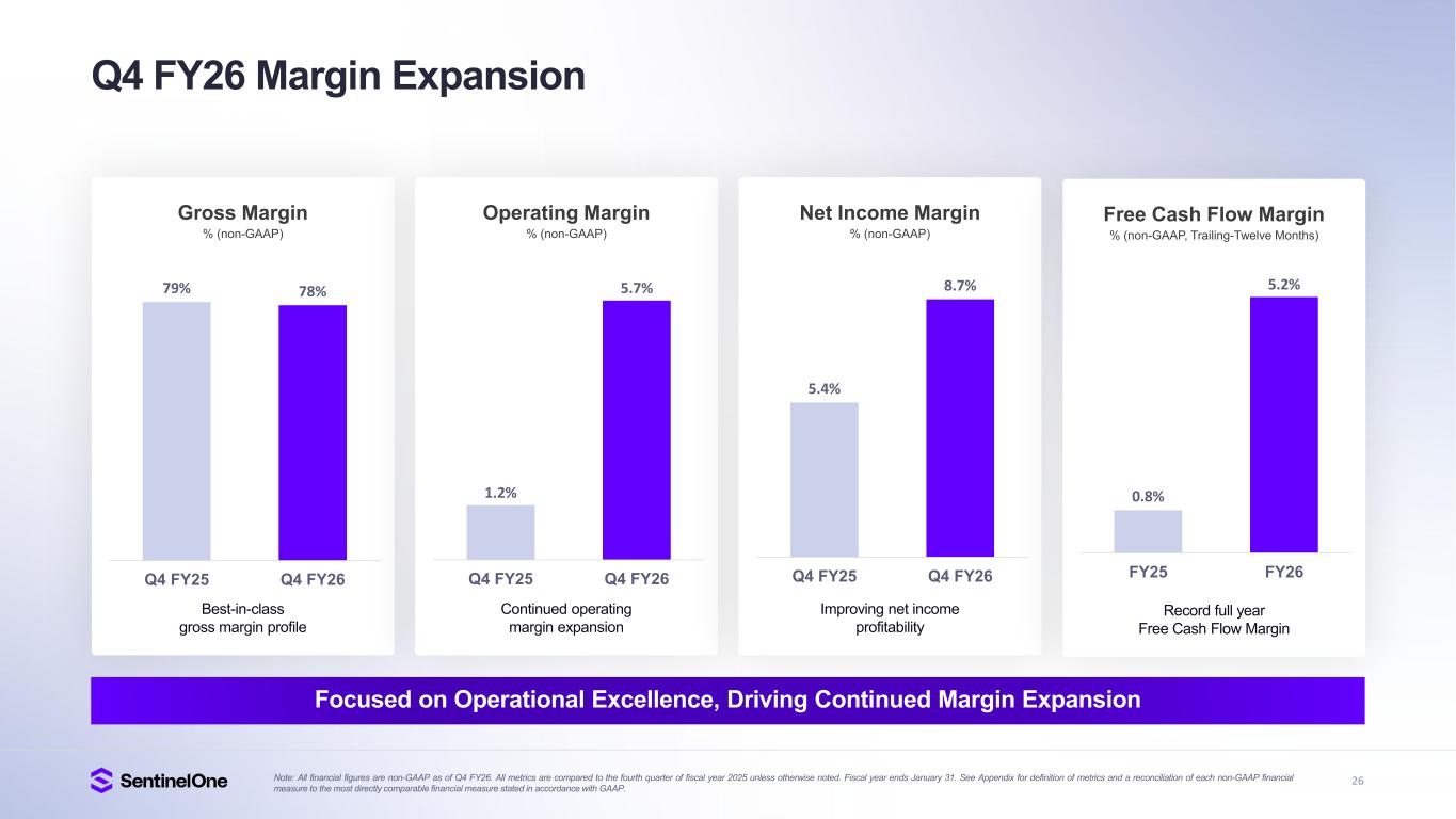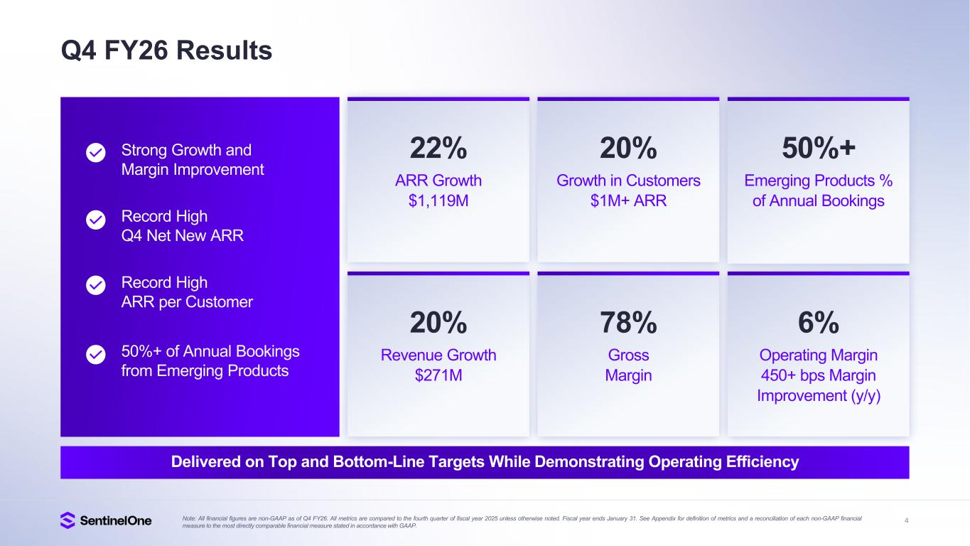 25 $226 $229 $242 $259 $271 $- $50 $10 0 $15 0 $20 0 $25 0 $30 0 Q4'25 Q1'26 Q2'26 Q3'26 Q4'26 $920 $948 $1,001 $1,055 $1,119 $20 0 $30 0 $40 0 $50 0 $60 0 $70 0 $80 0 $90 0 $1,0 00 $1,1 00 $1,2 00 Q4'25 Q1'26 Q2'26 Q3'26 Q4'26 Q4 FY26 ARR & Revenue Growth Annualized Recurring Revenue (ARR) (in millions) 22% (y/y) Growth in Q4 FY26 Revenue (in millions) 20% (y/y) Growth in Q4 FY26 Strong Growth Profile, Outperformed Expectations Reported Revenue Met or Exceeded Guidance Scaling the Best-in-Class AI Security Platform for the Future