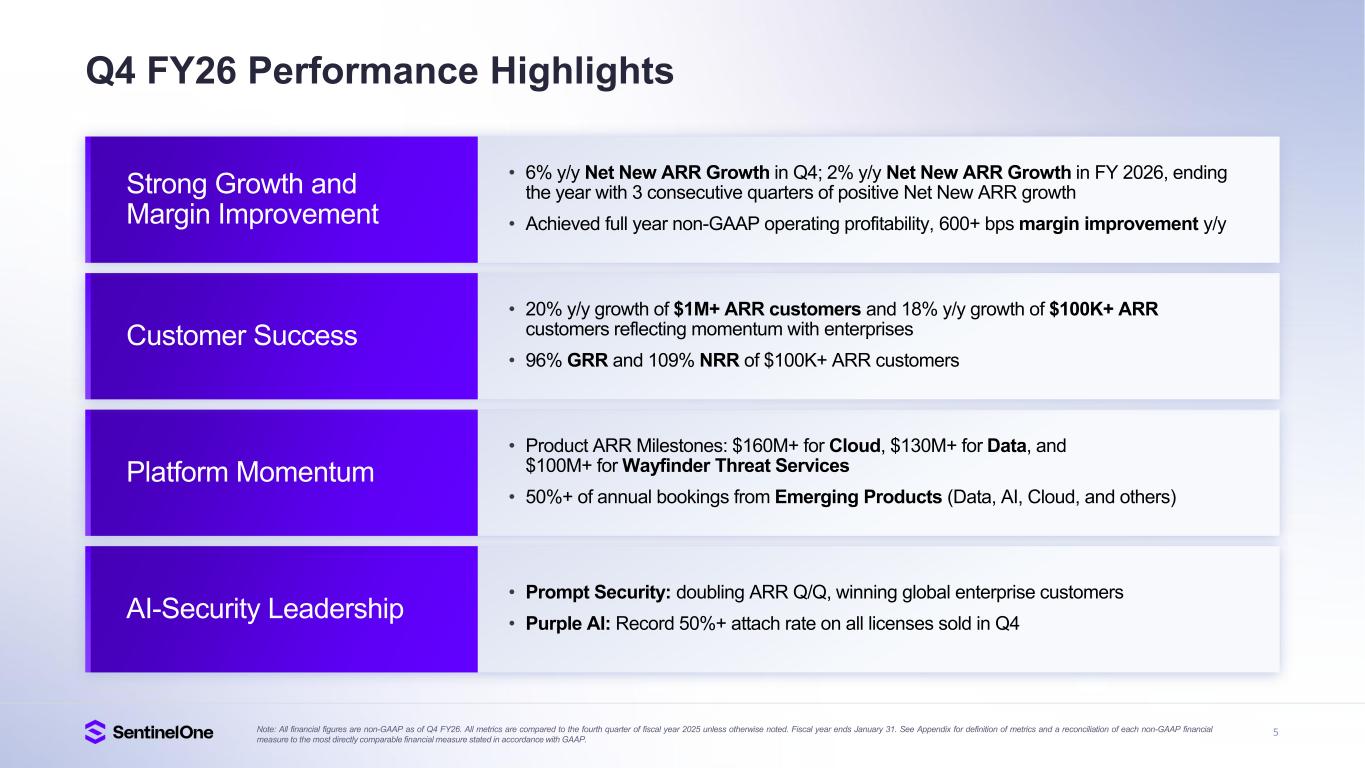 4 Q4 FY26 Results Note: All financial figures are non-GAAP as of Q4 FY26. All metrics are compared to the fourth quarter of fiscal year 2025 unless otherwise noted. Fiscal year ends January 31. See Appendix for definition of metrics and a reconciliation of each non-GAAP financial measure to the most directly comparable financial measure stated in accordance with GAAP. 22% ARR Growth $1,119M 20% Growth in Customers $1M+ ARR 50%+ Emerging Products % of Annual Bookings 78% Gross Margin 6% Operating Margin 450+ bps Margin Improvement (y/y) Strong Growth and Margin Improvement Record High Q4 Net New ARR Record High ARR per Customer 50%+ of Annual Bookings from Emerging Products Delivered on Top and Bottom-Line Targets While Demonstrating Operating Efficiency 20% Revenue Growth $271M