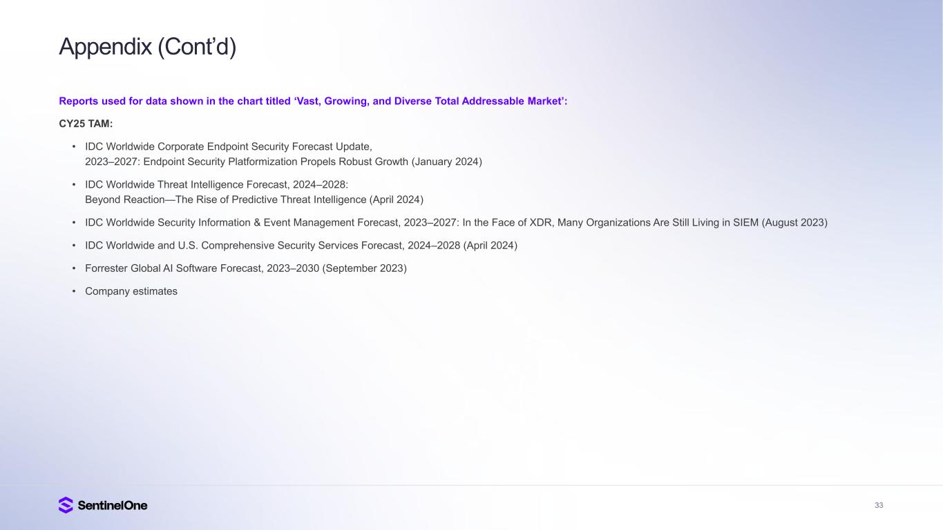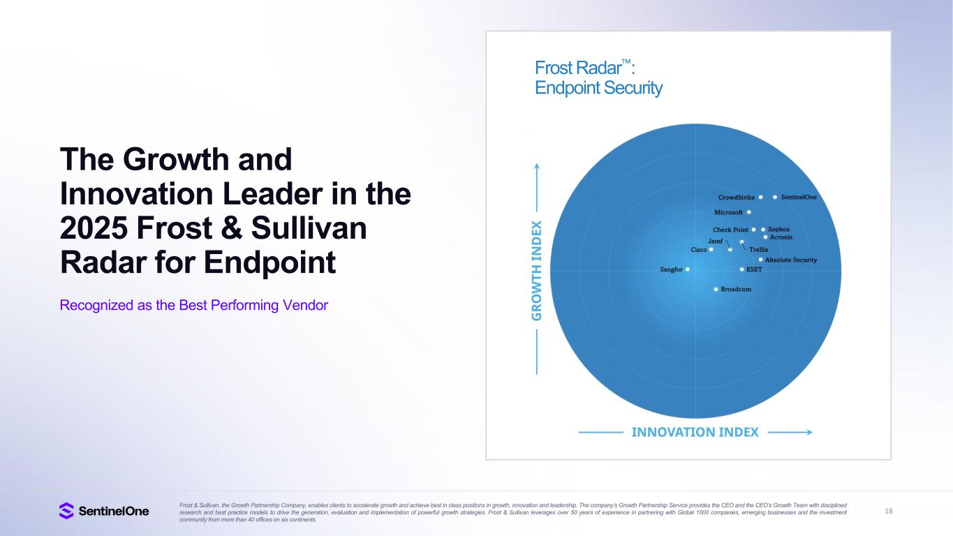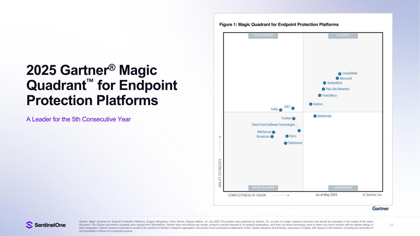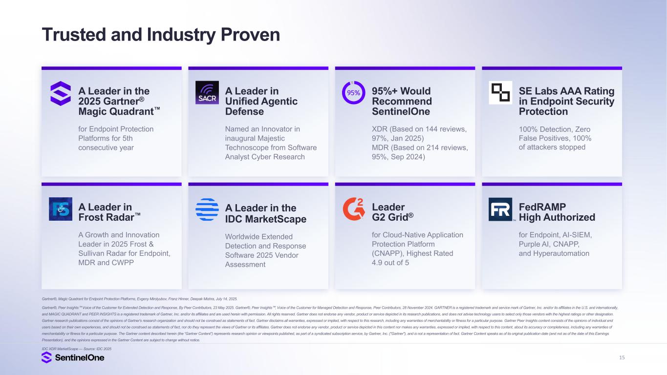 15 Trusted and Industry Proven Gartner®, Magic Quadrant for Endpoint Protection Platforms, Evgeny Mirolyubov, Franz Hinner, Deepak Mishra, July 14, 2025. Gartner®, Peer Insights Voice of the Customer for Extended Detection and Response, By Peer Contributors, 23 May 2025. Gartner®, Peer Insights , Voice of the Customer for Managed Detection and Response, Peer Contributors, 28 November 2024. GARTNER is a registered trademark and service mark of Gartner, Inc. and/or its affiliates in the U.S. and internationally, and MAGIC QUADRANT and PEER INSIGHTS is a registered trademark of Gartner, Inc. and/or its affiliates and are used herein with permission. All rights reserved. Gartner does not endorse any vendor, product or service depicted in its research publications, and does not advise technology users to select only those vendors with the highest ratings or other designation. Gartner research publications consist of the opinions of Gartner’s research organization and should not be construed as statements of fact. Gartner disclaims all warranties, expressed or implied, with respect to this research, including any warranties of merchantability or fitness for a particular purpose. Gartner Peer Insights content consists of the opinions of individual end users based on their own experiences, and should not be construed as statements of fact, nor do they represent the views of Gartner or its affiliates. Gartner does not endorse any vendor, product or service depicted in this content nor makes any warranties, expressed or implied, with respect to this content, about its accuracy or completeness, including any warranties of merchantability or fitness for a particular purpose. The Gartner content described herein (the “Gartner Content”) represents research opinion or viewpoints published, as part of a syndicated subscription service, by Gartner, Inc. ("Gartner"), and is not a representation of fact. Gartner Content speaks as of its original publication date (and not as of the date of this Earnings Presentation), and the opinions expressed in the Gartner Content are subject to change without notice. IDC XDR MarketScape — Source: IDC 2025 Leader G2 Grid® for Cloud-Native Application Protection Platform (CNAPP), Highest Rated 4.9 out of 5 FedRAMP High Authorized for Endpoint, AI-SIEM, Purple AI, CNAPP, and Hyperautomation A Leader in Frost Radar A Growth and Innovation Leader in 2025 Frost & Sullivan Radar for Endpoint, MDR and CWPP A Leader in the 2025 Gartner® Magic Quadrant for Endpoint Protection Platforms for 5th consecutive year 95%+ Would Recommend SentinelOne XDR (Based on 144 reviews, 97%, Jan 2025) MDR (Based on 214 reviews, 95%, Sep 2024) A Leader in Unified Agentic Defense Named an Innovator in inaugural Majestic Technoscope from Software Analyst Cyber Research A Leader in the IDC MarketScape Worldwide Extended Detection and Response Software 2025 Vendor Assessment SE Labs AAA Rating in Endpoint Security Protection 100% Detection, Zero False Positives, 100% of attackers stopped