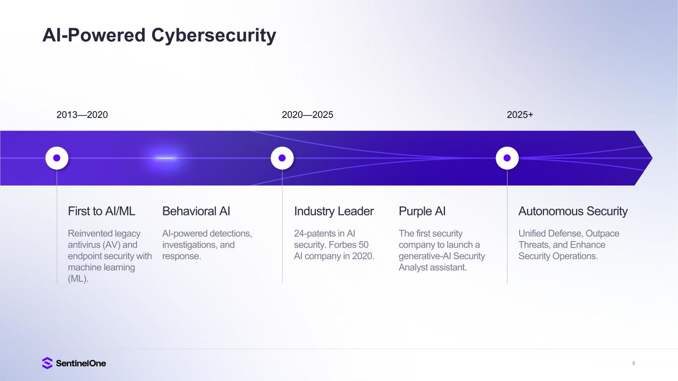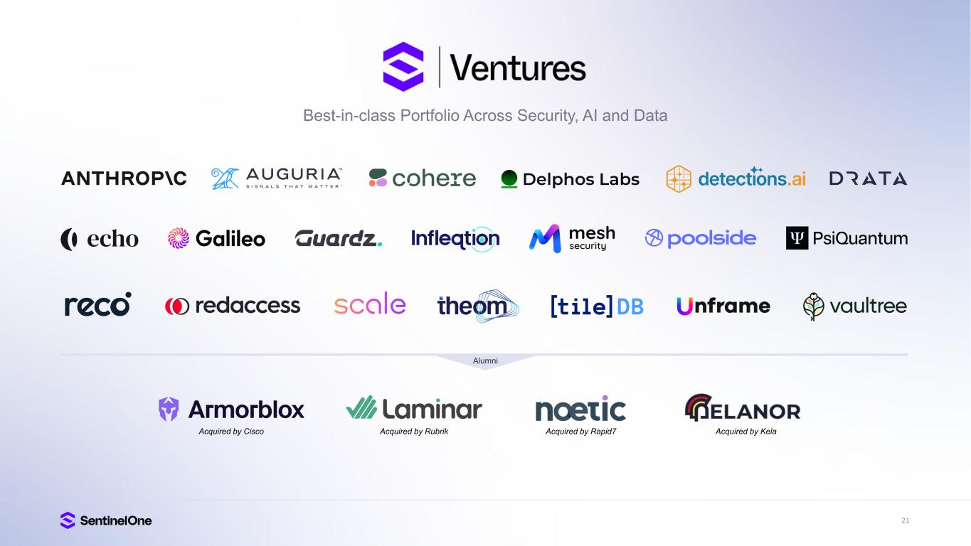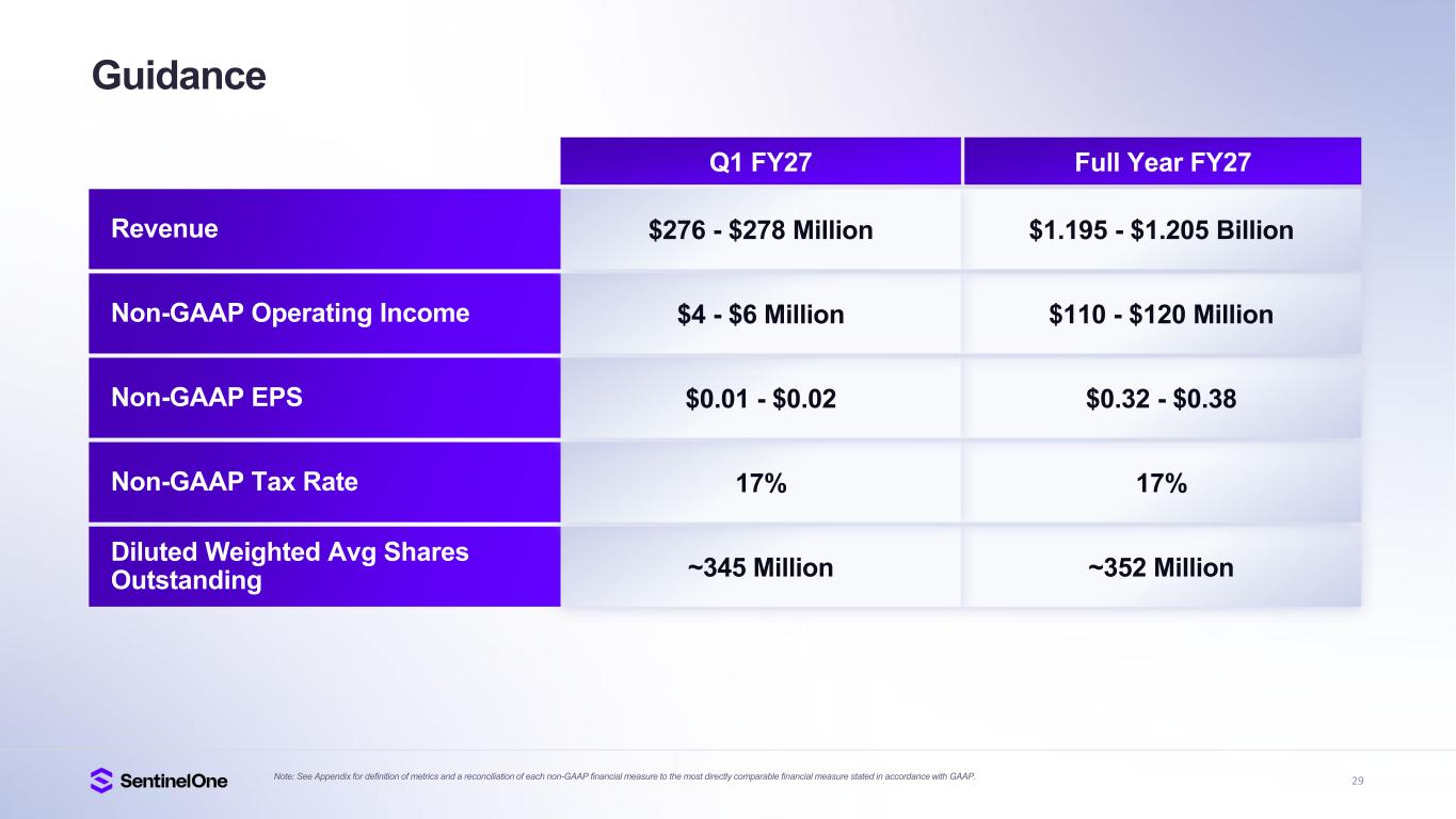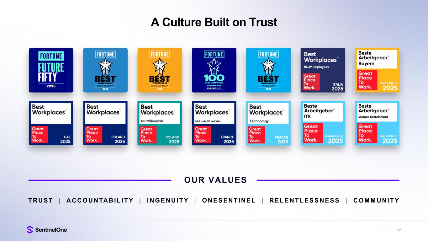 15 Trusted and Industry Proven Gartner®, Magic Quadrant for Endpoint Protection Platforms, Evgeny Mirolyubov, Franz Hinner, Deepak Mishra, July 14, 2025. Gartner®, Peer Insights Voice of the Customer for Extended Detection and Response, By Peer Contributors, 23 May 2025. Gartner®, Peer Insights , Voice of the Customer for Managed Detection and Response, Peer Contributors, 28 November 2024. GARTNER is a registered trademark and service mark of Gartner, Inc. and/or its affiliates in the U.S. and internationally, and MAGIC QUADRANT and PEER INSIGHTS is a registered trademark of Gartner, Inc. and/or its affiliates and are used herein with permission. All rights reserved. Gartner does not endorse any vendor, product or service depicted in its research publications, and does not advise technology users to select only those vendors with the highest ratings or other designation. Gartner research publications consist of the opinions of Gartner’s research organization and should not be construed as statements of fact. Gartner disclaims all warranties, expressed or implied, with respect to this research, including any warranties of merchantability or fitness for a particular purpose. Gartner Peer Insights content consists of the opinions of individual end users based on their own experiences, and should not be construed as statements of fact, nor do they represent the views of Gartner or its affiliates. Gartner does not endorse any vendor, product or service depicted in this content nor makes any warranties, expressed or implied, with respect to this content, about its accuracy or completeness, including any warranties of merchantability or fitness for a particular purpose. The Gartner content described herein (the “Gartner Content”) represents research opinion or viewpoints published, as part of a syndicated subscription service, by Gartner, Inc. ("Gartner"), and is not a representation of fact. Gartner Content speaks as of its original publication date (and not as of the date of this Earnings Presentation), and the opinions expressed in the Gartner Content are subject to change without notice. IDC XDR MarketScape — Source: IDC 2025 Leader G2 Grid® for Cloud-Native Application Protection Platform (CNAPP), Highest Rated 4.9 out of 5 FedRAMP High Authorized for Endpoint, AI-SIEM, Purple AI, CNAPP, and Hyperautomation A Leader in Frost Radar A Growth and Innovation Leader in 2025 Frost & Sullivan Radar for Endpoint, MDR and CWPP A Leader in the 2025 Gartner® Magic Quadrant for Endpoint Protection Platforms for 5th consecutive year 95%+ Would Recommend SentinelOne XDR (Based on 144 reviews, 97%, Jan 2025) MDR (Based on 214 reviews, 95%, Sep 2024) A Leader in Unified Agentic Defense Named an Innovator in inaugural Majestic Technoscope from Software Analyst Cyber Research A Leader in the IDC MarketScape Worldwide Extended Detection and Response Software 2025 Vendor Assessment SE Labs AAA Rating in Endpoint Security Protection 100% Detection, Zero False Positives, 100% of attackers stopped