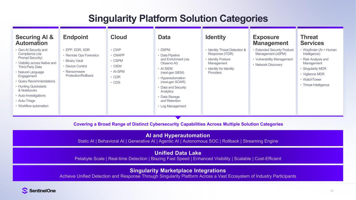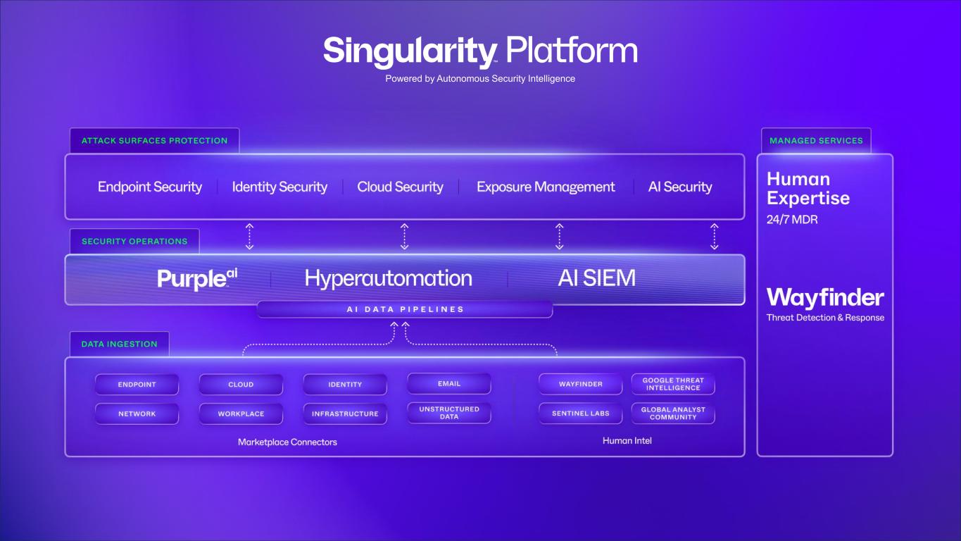 11 Singularity Platform Solution Categories Securing AI & Automation • EPP, EDR, XDR • Remote Ops Forensics • Binary Vault • Device Control • Ransomware Protection/Rollback Endpoint • CWP • CNAPP • CSPM • CIEM • AI-SPM • CDR • CDS Cloud • DSPM • Data Pipeline and Enrichment (via Observo AI) • AI SIEM (next-gen SIEM) • Hyperautomation (next-gen SOAR) • Data and Security Analytics • Data Storage and Retention • Log Management Data • Identity Threat Detection & Response (ITDR) • Identity Posture Management • Identity for Identity Providers Identity • Extended Security Posture Management (xSPM) • Vulnerability Management • Network Discovery Exposure Management • Wayfinder (AI + Human Intelligence) • Risk Analysis and Management • Singularity MDR • Vigilance MDR • WatchTower • Threat Intelligence Threat Services AI and Hyperautomation Covering a Broad Range of Distinct Cybersecurity Capabilities Across Multiple Solution Categories Unified Data Lake Singularity Marketplace Integrations • Gen-AI Security and Compliance (via Prompt Security) • Visibility across Native and Third-Party Data • Natural Language Engagement • Query Recommendations • Hunting Quickstarts & Notebooks • Auto-Investigations • Auto-Triage • Workflow automation