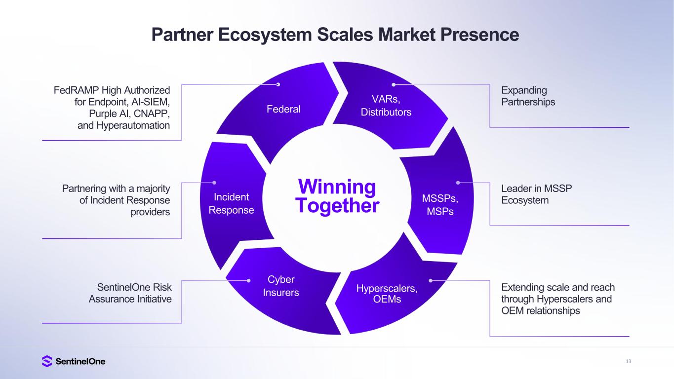 13 Partner Ecosystem Scales Market Presence VARs, DistributorsFederal MSSPs, MSPs Hyperscalers, OEMs Winning Together Cyber Insurers Incident Response Leader in MSSP Ecosystem Extending scale and reach through Hyperscalers and OEM relationships SentinelOne Risk Assurance Initiative FedRAMP High Authorized for Endpoint, AI-SIEM, Purple AI, CNAPP, and Hyperautomation Partnering with a majority of Incident Response providers Expanding Partnerships