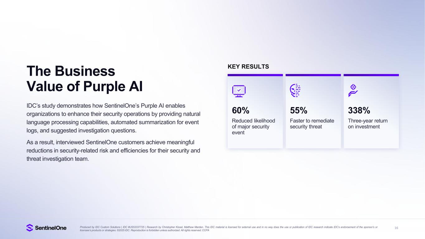 16Produced by IDC Custom Solutions | IDC #US53337725 | Research by Christopher Kissel, Matthew Marden. This IDC material is licensed for external use and in no way does the use or publication of IDC research indicate IDC’s endorsement of the sponsor’s or licensee’s products or strategies. ©2025 IDC. Reproduction is forbidden unless authorized. All rights reserved. CCPA The Business Value of Purple AI IDC’s study demonstrates how SentinelOne’s Purple AI enables organizations to enhance their security operations by providing natural language processing capabilities, automated summarization for event logs, and suggested investigation questions. As a result, interviewed SentinelOne customers achieve meaningful reductions in security-related risk and efficiencies for their security and threat investigation team. 338% Three-year return on investment 55% Faster to remediate security threat KEY RESULTS 60% Reduced likelihood of major security event