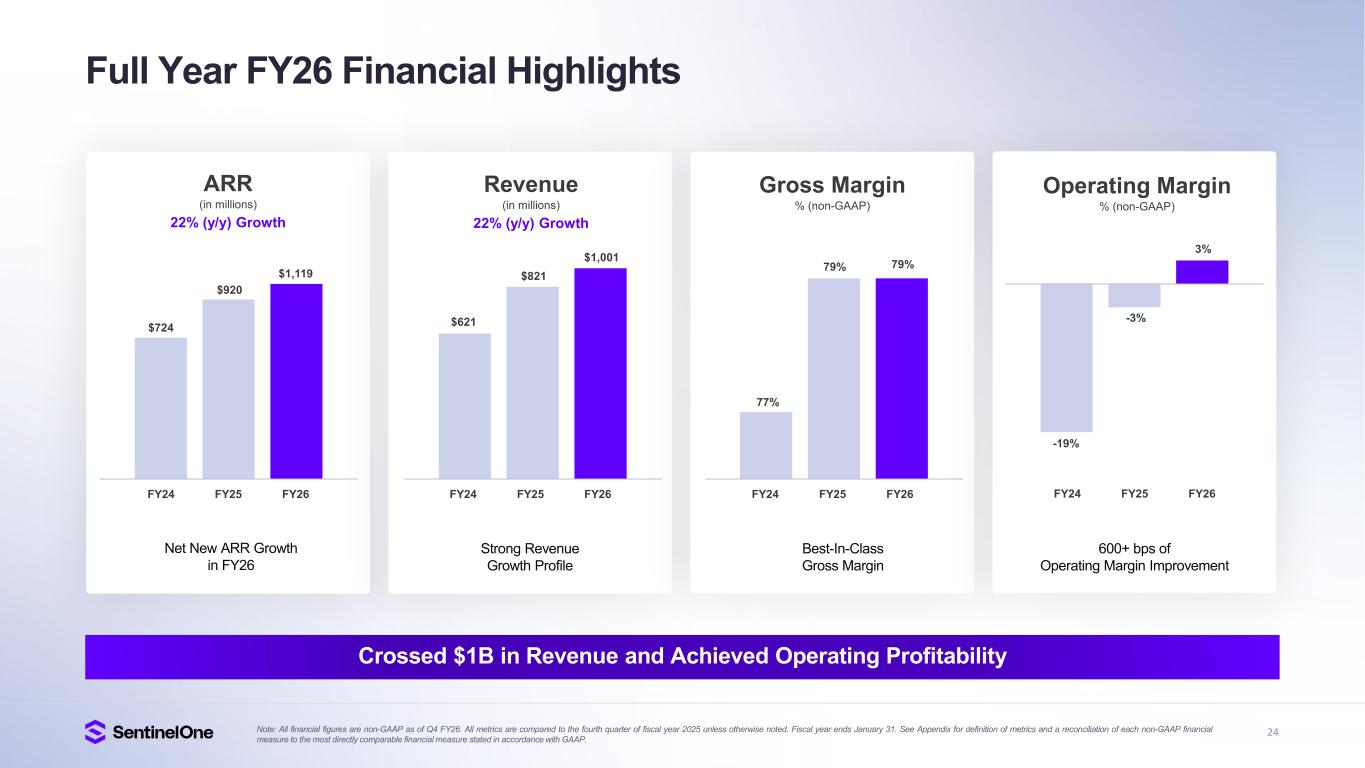 24 FY26FY24 FY25 FY26FY24 FY25 FY26FY24 FY25 FY26FY24 FY25 Full Year FY26 Financial Highlights Operating Margin % (non-GAAP) -19% 3% Revenue (in millions) 22% (y/y) Growth $621 $821 $1,001 Strong Revenue Growth Profile Gross Margin % (non-GAAP) 77% 79% 79% Best-In-Class Gross Margin 600+ bps of Operating Margin Improvement ARR (in millions) 22% (y/y) Growth Net New ARR Growth in FY26 $724 $920 $1,119 -3% Note: All financial figures are non-GAAP as of Q4 FY26. All metrics are compared to the fourth quarter of fiscal year 2025 unless otherwise noted. Fiscal year ends January 31. See Appendix for definition of metrics and a reconciliation of each non-GAAP financial measure to the most directly comparable financial measure stated in accordance with GAAP. Crossed $1B in Revenue and Achieved Operating Profitability