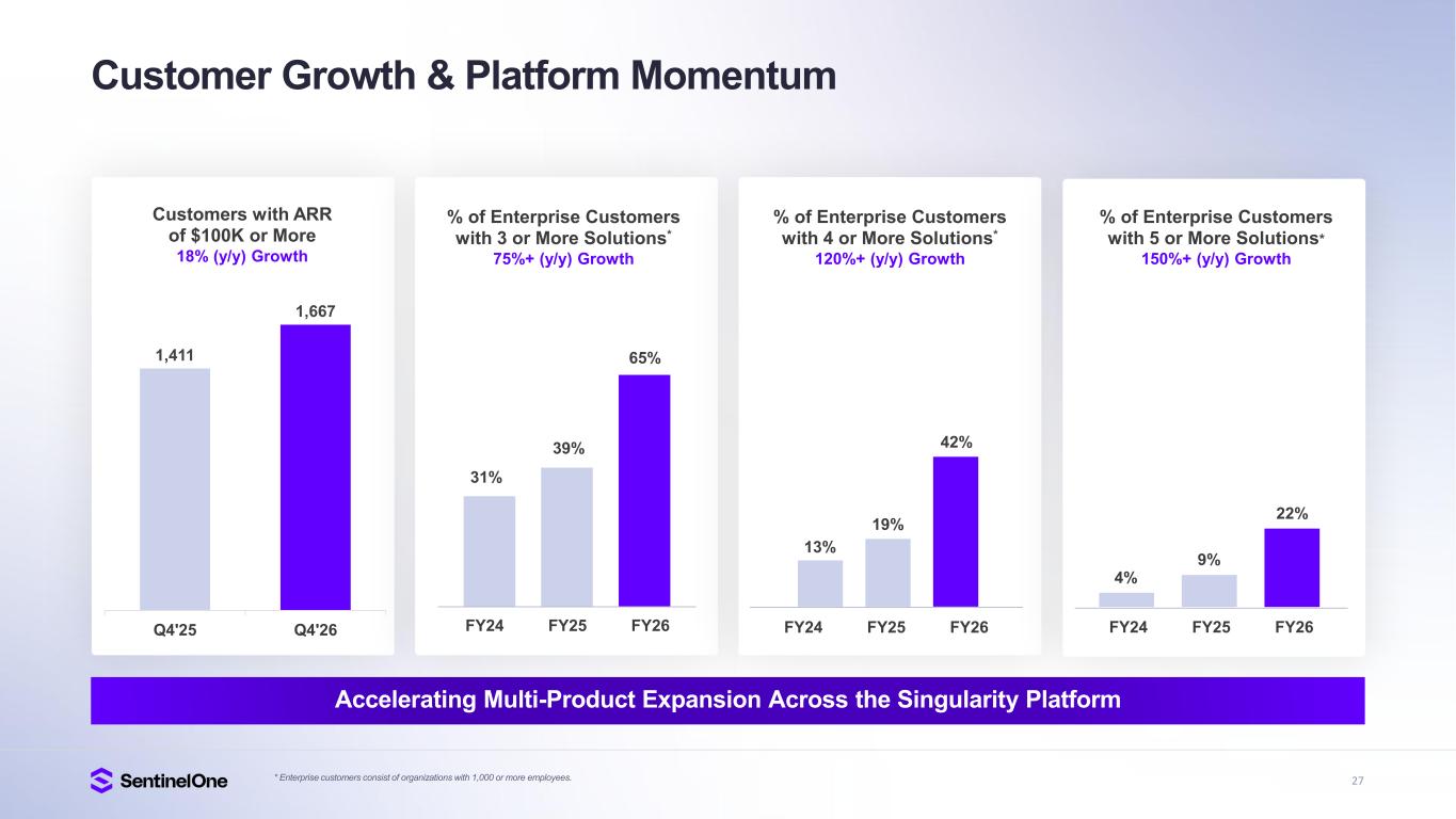 26 Q4 FY26 Margin Expansion Best-in-class gross margin profile Gross Margin % (non-GAAP) 79% 78% 0% 10% 20% 30% 40% 50% 60% 70% 80% 90% Q4 FY25 Q4 FY26 Continued operating margin expansion Operating Margin % (non-GAAP) 1.2% 5.7% -0.5% 0.5 % 1.5 % 2.5 % 3.5 % 4.5 % 5.5 % 6.5 % Q4 FY25 Q4 FY26 Improving net income profitability Net Income Margin % (non-GAAP) 5.4% 8.7% 0.0 % 2.0 % 4.0 % 6.0 % 8.0 % 10. 0% 12. 0% Q4 FY25 Q4 FY26 Record full year Free Cash Flow Margin Free Cash Flow Margin % (non-GAAP, Trailing-Twelve Months) 0.8% 5.2% 0.0 % 1.0 % 2.0 % 3.0 % 4.0 % 5.0 % 6.0 % FY25 FY26 Focused on Operational Excellence, Driving Continued Margin Expansion Note: All financial figures are non-GAAP as of Q4 FY26. All metrics are compared to the fourth quarter of fiscal year 2025 unless otherwise noted. Fiscal year ends January 31. See Appendix for definition of metrics and a reconciliation of each non-GAAP financial measure to the most directly comparable financial measure stated in accordance with GAAP.