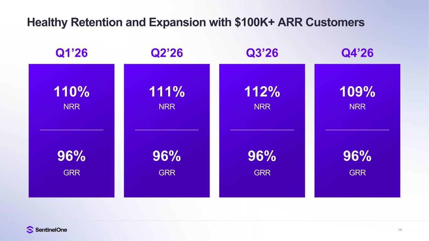 27 Customer Growth & Platform Momentum Accelerating Multi-Product Expansion Across the Singularity Platform 1,411 1,667 0 200 400 600 800 100 0 120 0 140 0 160 0 Q4'25 Q4'26 Customers with ARR of $100K or More 18% (y/y) Growth 31 39 65 0 10 20 30 40 50 60 70 31% 39% 65% % of Enterprise Customers with 3 or More Solutions* 75%+ (y/y) Growth % of Enterprise Customers with 4 or More Solutions* 120%+ (y/y) Growth % of Enterprise Customers with 5 or More Solutions* 150%+ (y/y) Growth FY26FY24 FY25 FY26FY24 FY25 13% 19% 42% FY26FY24 FY25 4% 9% 22% * Enterprise customers consist of organizations with 1,000 or more employees.