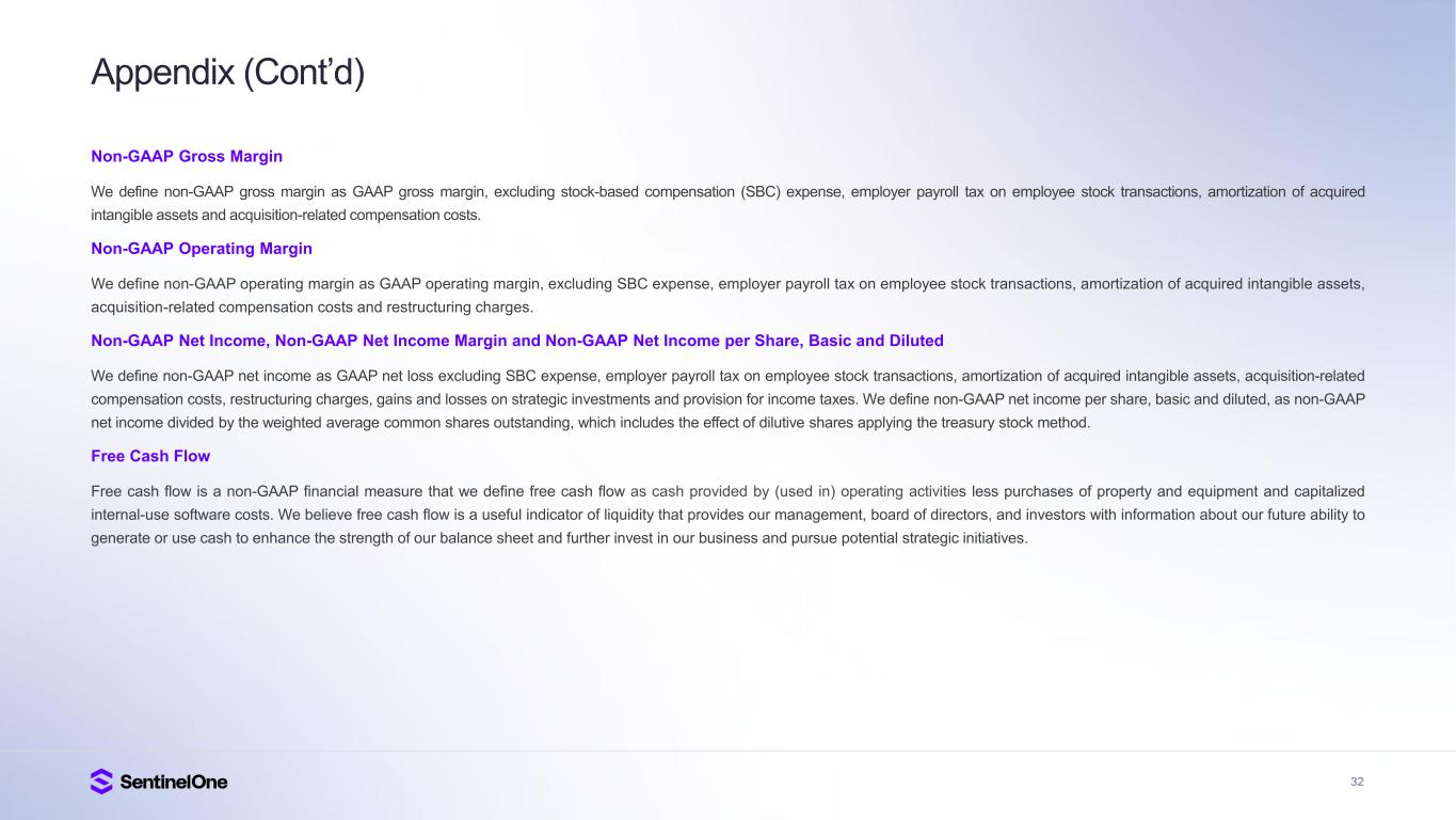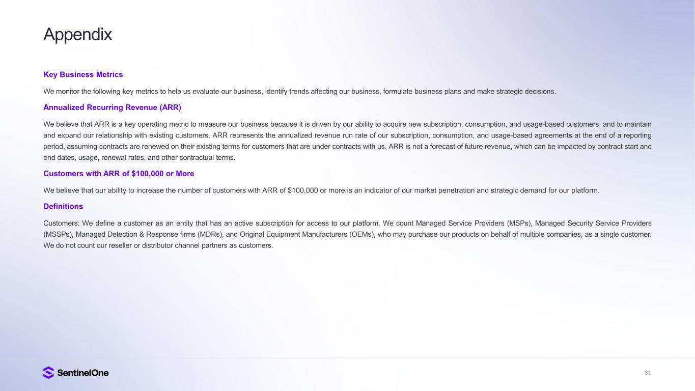 31 Appendix Key Business Metrics We monitor the following key metrics to help us evaluate our business, identify trends affecting our business, formulate business plans and make strategic decisions. Annualized Recurring Revenue (ARR) We believe that ARR is a key operating metric to measure our business because it is driven by our ability to acquire new subscription, consumption, and usage-based customers, and to maintain and expand our relationship with existing customers. ARR represents the annualized revenue run rate of our subscription, consumption, and usage-based agreements at the end of a reporting period, assuming contracts are renewed on their existing terms for customers that are under contracts with us. ARR is not a forecast of future revenue, which can be impacted by contract start and end dates, usage, renewal rates, and other contractual terms. Customers with ARR of $100,000 or More We believe that our ability to increase the number of customers with ARR of $100,000 or more is an indicator of our market penetration and strategic demand for our platform. Definitions Customers: We define a customer as an entity that has an active subscription for access to our platform. We count Managed Service Providers (MSPs), Managed Security Service Providers (MSSPs), Managed Detection & Response firms (MDRs), and Original Equipment Manufacturers (OEMs), who may purchase our products on behalf of multiple companies, as a single customer. We do not count our reseller or distributor channel partners as customers.