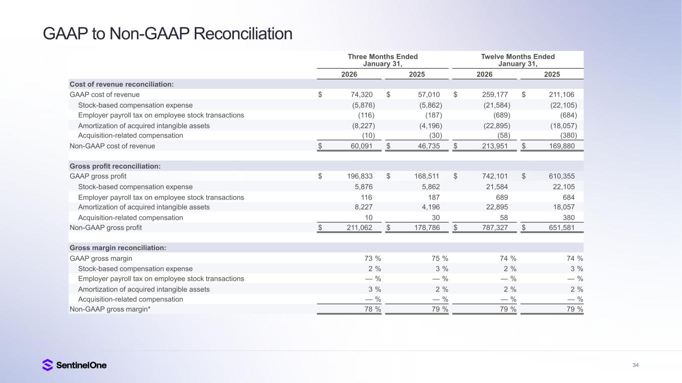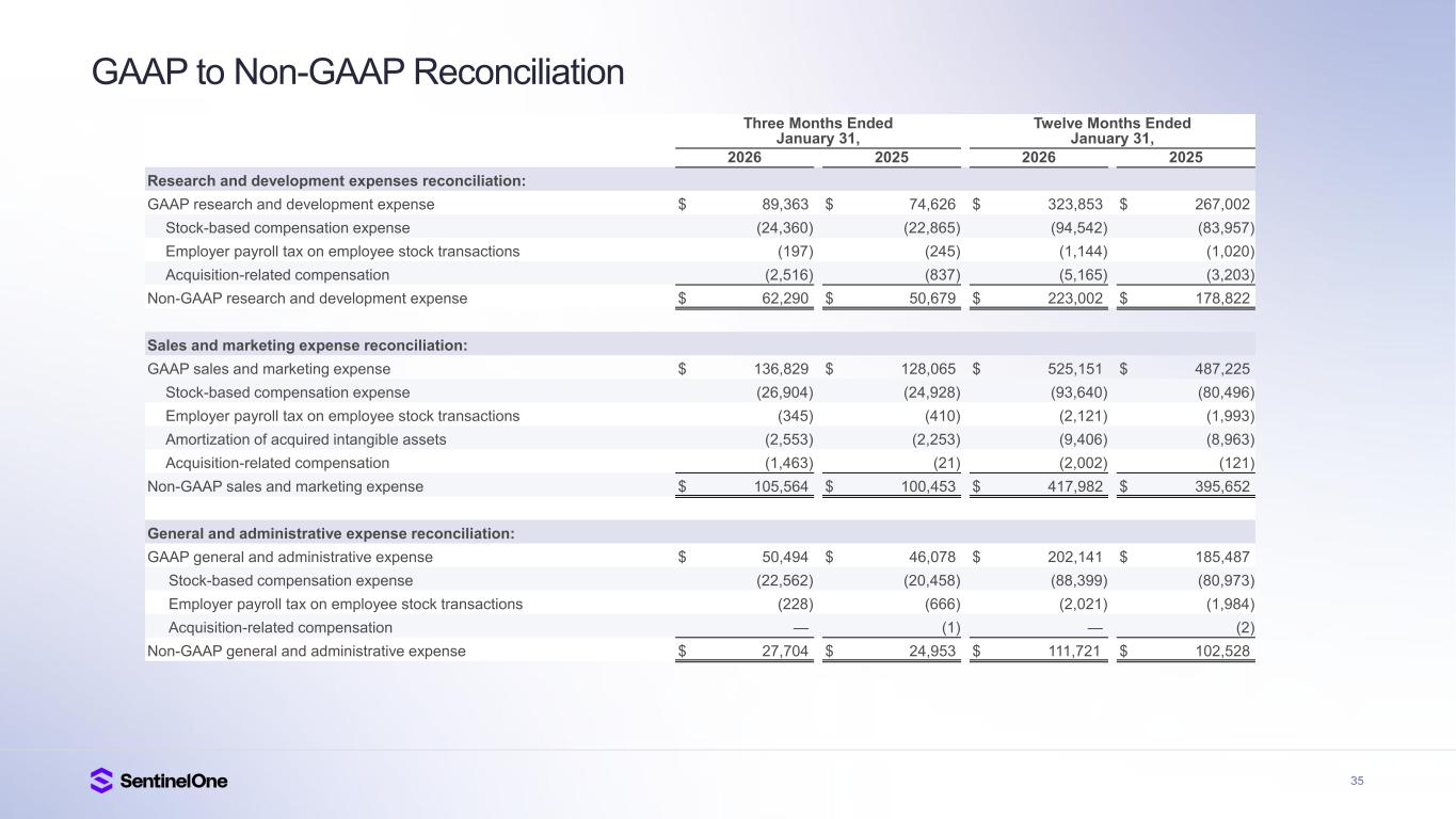 34 GAAP to Non-GAAP Reconciliation Three Months Ended January 31, Twelve Months Ended January 31, 2026 2025 2026 2025 Cost of revenue reconciliation: GAAP cost of revenue $ 74,320 $ 57,010 $ 259,177 $ 211,106 Stock-based compensation expense (5,876) (5,862) (21,584) (22,105) Employer payroll tax on employee stock transactions (116) (187) (689) (684) Amortization of acquired intangible assets (8,227) (4,196) (22,895) (18,057) Acquisition-related compensation (10) (30) (58) (380) Non-GAAP cost of revenue $ 60,091 $ 46,735 $ 213,951 $ 169,880 Gross profit reconciliation: GAAP gross profit $ 196,833 $ 168,511 $ 742,101 $ 610,355 Stock-based compensation expense 5,876 5,862 21,584 22,105 Employer payroll tax on employee stock transactions 116 187 689 684 Amortization of acquired intangible assets 8,227 4,196 22,895 18,057 Acquisition-related compensation 10 30 58 380 Non-GAAP gross profit $ 211,062 $ 178,786 $ 787,327 $ 651,581 Gross margin reconciliation: GAAP gross margin 73 % 75 % 74 % 74 % Stock-based compensation expense 2 % 3 % 2 % 3 % Employer payroll tax on employee stock transactions — % — % — % — % Amortization of acquired intangible assets 3 % 2 % 2 % 2 % Acquisition-related compensation — % — % — % — % Non-GAAP gross margin* 78 % 79 % 79 % 79 %