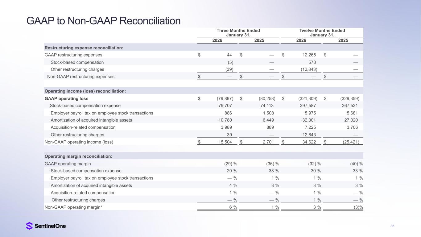 35 GAAP to Non-GAAP Reconciliation Three Months Ended January 31, Twelve Months Ended January 31, 2026 2025 2026 2025 Research and development expenses reconciliation: GAAP research and development expense $ 89,363 $ 74,626 $ 323,853 $ 267,002 Stock-based compensation expense (24,360) (22,865) (94,542) (83,957) Employer payroll tax on employee stock transactions (197) (245) (1,144) (1,020) Acquisition-related compensation (2,516) (837) (5,165) (3,203) Non-GAAP research and development expense $ 62,290 $ 50,679 $ 223,002 $ 178,822 Sales and marketing expense reconciliation: GAAP sales and marketing expense $ 136,829 $ 128,065 $ 525,151 $ 487,225 Stock-based compensation expense (26,904) (24,928) (93,640) (80,496) Employer payroll tax on employee stock transactions (345) (410) (2,121) (1,993) Amortization of acquired intangible assets (2,553) (2,253) (9,406) (8,963) Acquisition-related compensation (1,463) (21) (2,002) (121) Non-GAAP sales and marketing expense $ 105,564 $ 100,453 $ 417,982 $ 395,652 General and administrative expense reconciliation: GAAP general and administrative expense $ 50,494 $ 46,078 $ 202,141 $ 185,487 Stock-based compensation expense (22,562) (20,458) (88,399) (80,973) Employer payroll tax on employee stock transactions (228) (666) (2,021) (1,984) Acquisition-related compensation — (1) — (2) Non-GAAP general and administrative expense $ 27,704 $ 24,953 $ 111,721 $ 102,528