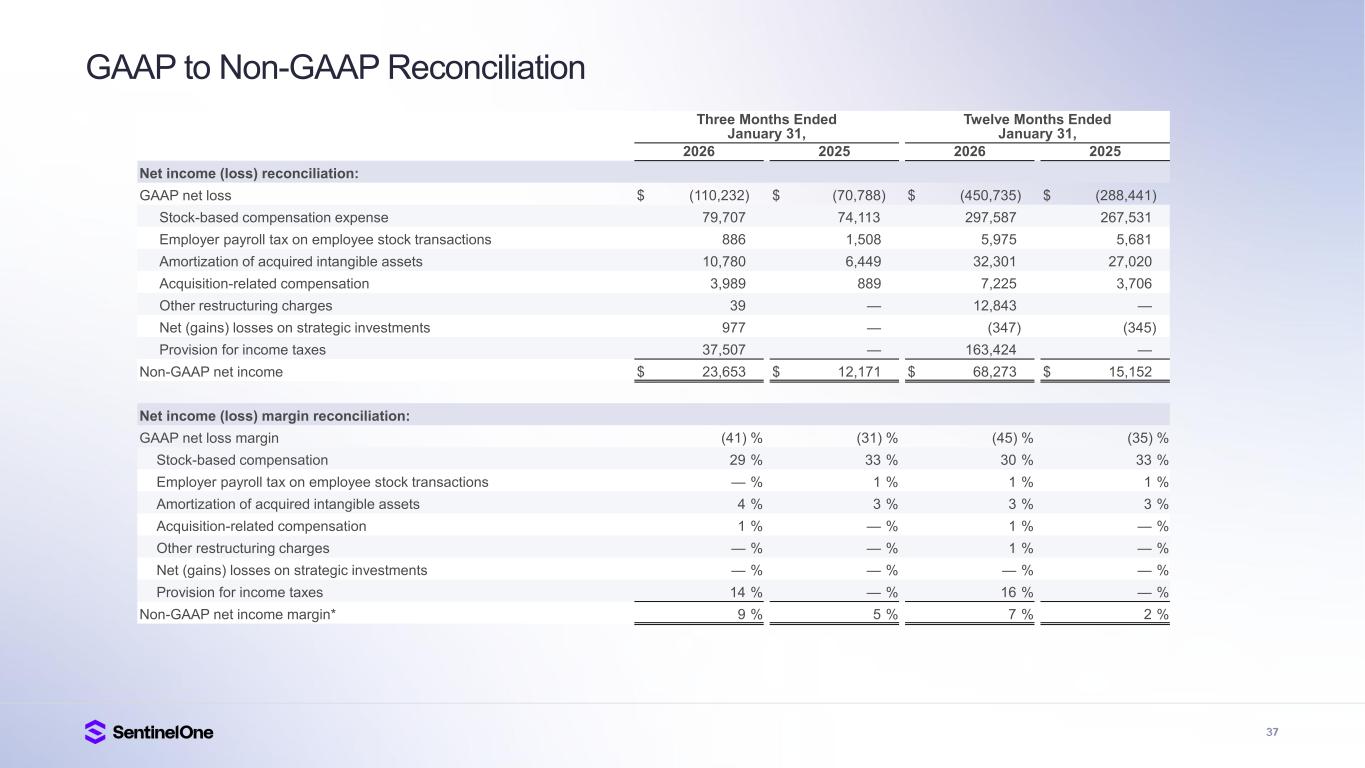 36 GAAP to Non-GAAP Reconciliation Three Months Ended January 31, Twelve Months Ended January 31, 2026 2025 2026 2025 Restructuring expense reconciliation: GAAP restructuring expenses $ 44 $ — $ 12,265 $ — Stock-based compensation (5) — 578 — Other restructuring charges (39) — (12,843) — Non-GAAP restructuring expenses $ — $ — $ — $ — Operating income (loss) reconciliation: GAAP operating loss $ (79,897) $ (80,258) $ (321,309) $ (329,359) Stock-based compensation expense 79,707 74,113 297,587 267,531 Employer payroll tax on employee stock transactions 886 1,508 5,975 5,681 Amortization of acquired intangible assets 10,780 6,449 32,301 27,020 Acquisition-related compensation 3,989 889 7,225 3,706 Other restructuring charges 39 — 12,843 — Non-GAAP operating income (loss) $ 15,504 $ 2,701 $ 34,622 $ (25,421) Operating margin reconciliation: GAAP operating margin (29) % (36) % (32) % (40) % Stock-based compensation expense 29 % 33 % 30 % 33 % Employer payroll tax on employee stock transactions — % 1 % 1 % 1 % Amortization of acquired intangible assets 4 % 3 % 3 % 3 % Acquisition-related compensation 1 % — % 1 % — % Other restructuring charges — % — % 1 % — % Non-GAAP operating margin* 6 % 1 % 3 % (3)%