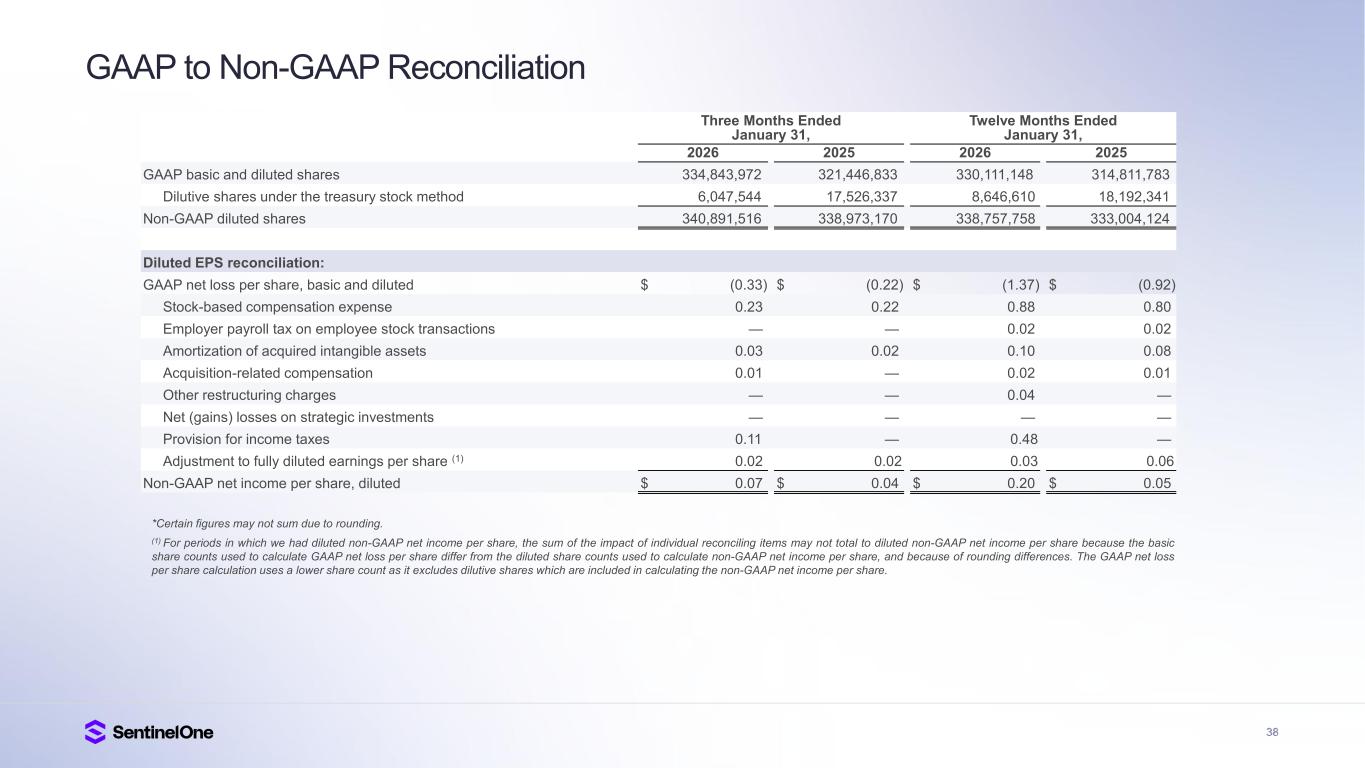 37 GAAP to Non-GAAP Reconciliation Three Months Ended January 31, Twelve Months Ended January 31, 2026 2025 2026 2025 Net income (loss) reconciliation: GAAP net loss $ (110,232) $ (70,788) $ (450,735) $ (288,441) Stock-based compensation expense 79,707 74,113 297,587 267,531 Employer payroll tax on employee stock transactions 886 1,508 5,975 5,681 Amortization of acquired intangible assets 10,780 6,449 32,301 27,020 Acquisition-related compensation 3,989 889 7,225 3,706 Other restructuring charges 39 — 12,843 — Net (gains) losses on strategic investments 977 — (347) (345) Provision for income taxes 37,507 — 163,424 — Non-GAAP net income $ 23,653 $ 12,171 $ 68,273 $ 15,152 Net income (loss) margin reconciliation: GAAP net loss margin (41) % (31) % (45) % (35) % Stock-based compensation 29 % 33 % 30 % 33 % Employer payroll tax on employee stock transactions — % 1 % 1 % 1 % Amortization of acquired intangible assets 4 % 3 % 3 % 3 % Acquisition-related compensation 1 % — % 1 % — % Other restructuring charges — % — % 1 % — % Net (gains) losses on strategic investments — % — % — % — % Provision for income taxes 14 % — % 16 % — % Non-GAAP net income margin* 9 % 5 % 7 % 2 %