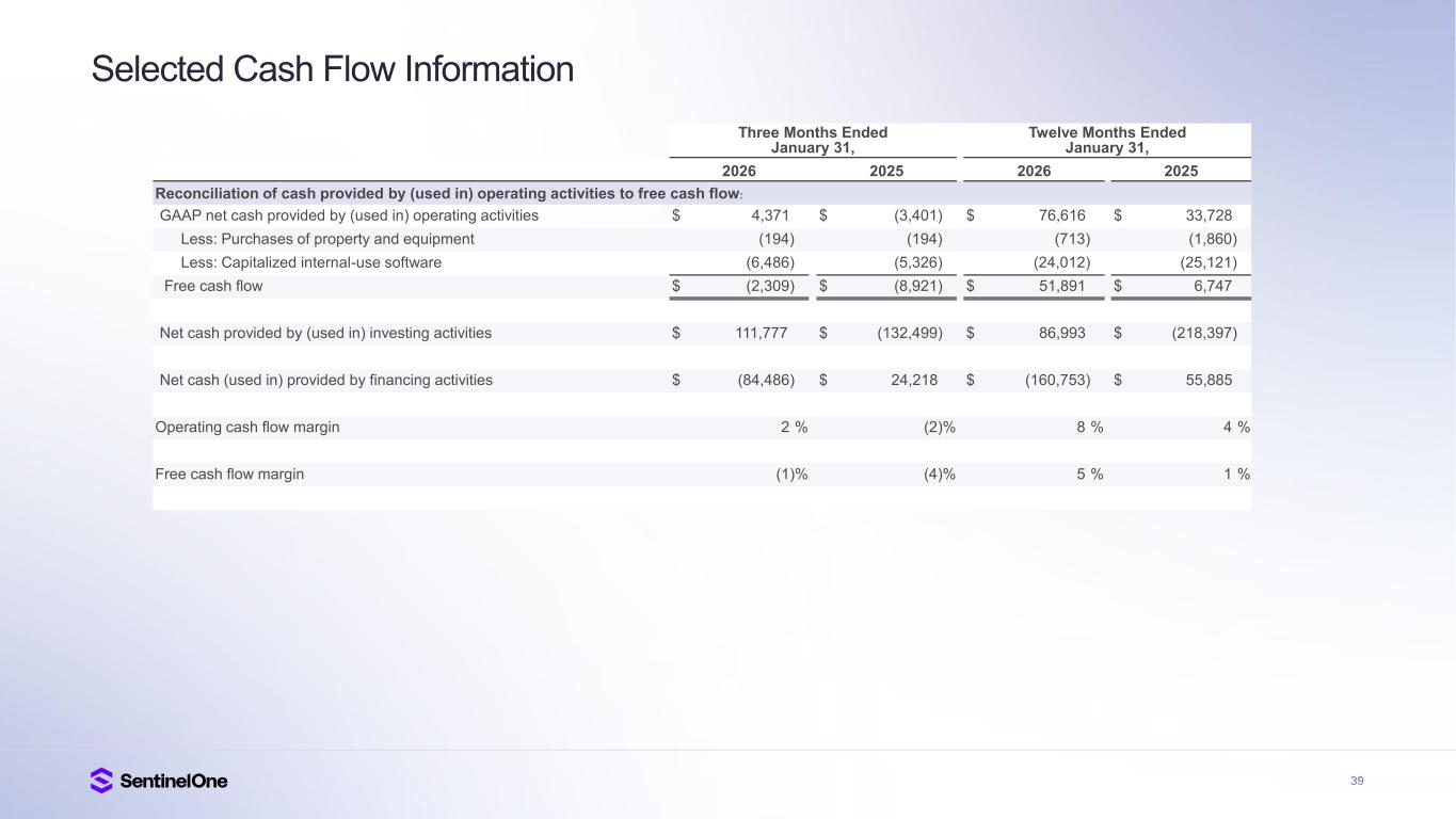 39 Selected Cash Flow Information Three Months Ended January 31, Twelve Months Ended January 31, 2026 2025 2026 2025 Reconciliation of cash provided by (used in) operating activities to free cash flow: GAAP net cash provided by (used in) operating activities $ 4,371 $ (3,401) $ 76,616 $ 33,728 Less: Purchases of property and equipment (194) (194) (713) (1,860) Less: Capitalized internal-use software (6,486) (5,326) (24,012) (25,121) Free cash flow $ (2,309) $ (8,921) $ 51,891 $ 6,747 Net cash provided by (used in) investing activities $ 111,777 $ (132,499) $ 86,993 $ (218,397) Net cash (used in) provided by financing activities $ (84,486) $ 24,218 $ (160,753) $ 55,885 Operating cash flow margin 2 % (2)% 8 % 4 % Free cash flow margin (1)% (4)% 5 % 1 %