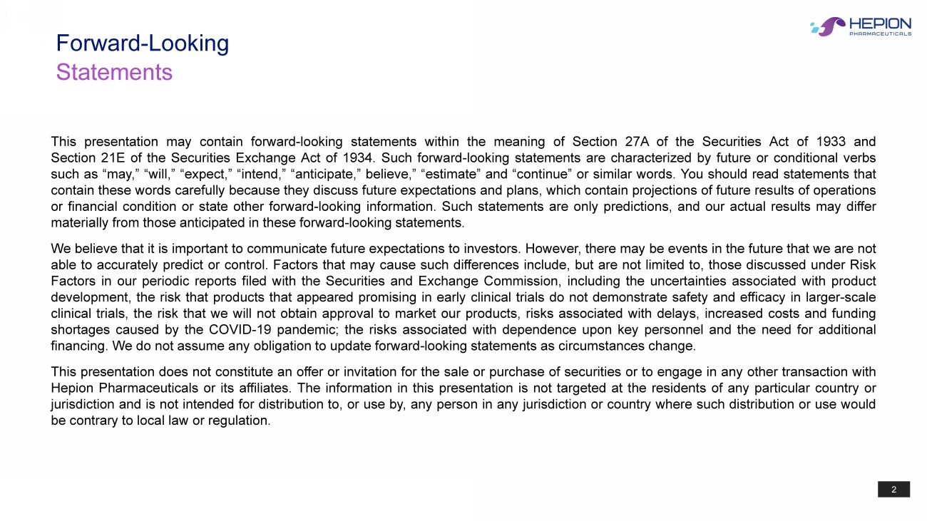 2 This presentation may contain forward - looking statements within the meaning of Section 27 A of the Securities Act of 1933 and Section 21 E of the Securities Exchange Act of 1934 . Such forward - looking statements are characterized by future or conditional verbs such as “may,” “will,” “expect,” “intend,” “anticipate,” believe,” “estimate” and “continue” or similar words . You should read statements that contain these words carefully because they discuss future expectations and plans, which contain projections of future results of operations or financial condition or state other forward - looking information . Such statements are only predictions, and our actual results may differ materially from those anticipated in these forward - looking statements . We believe that it is important to communicate future expectations to investors . However, there may be events in the future that we are not able to accurately predict or control . Factors that may cause such differences include, but are not limited to, those discussed under Risk Factors in our periodic reports filed with the Securities and Exchange Commission, including the uncertainties associated with product development, the risk that products that appeared promising in early clinical trials do not demonstrate safety and efficacy in larger - scale clinical trials, the risk that we will not obtain approval to market our products, risks associated with delays, increased costs and funding shortages caused by the COVID - 19 pandemic ; the risks associated with dependence upon key personnel and the need for additional financing . We do not assume any obligation to update forward - looking statements as circumstances change . This presentation does not constitute an offer or invitation for the sale or purchase of securities or to engage in any other transaction with Hepion Pharmaceuticals or its affiliates . The information in this presentation is not targeted at the residents of any particular country or jurisdiction and is not intended for distribution to, or use by, any person in any jurisdiction or country where such distribution or use would be contrary to local law or regulation . Statements Forward - Looking
