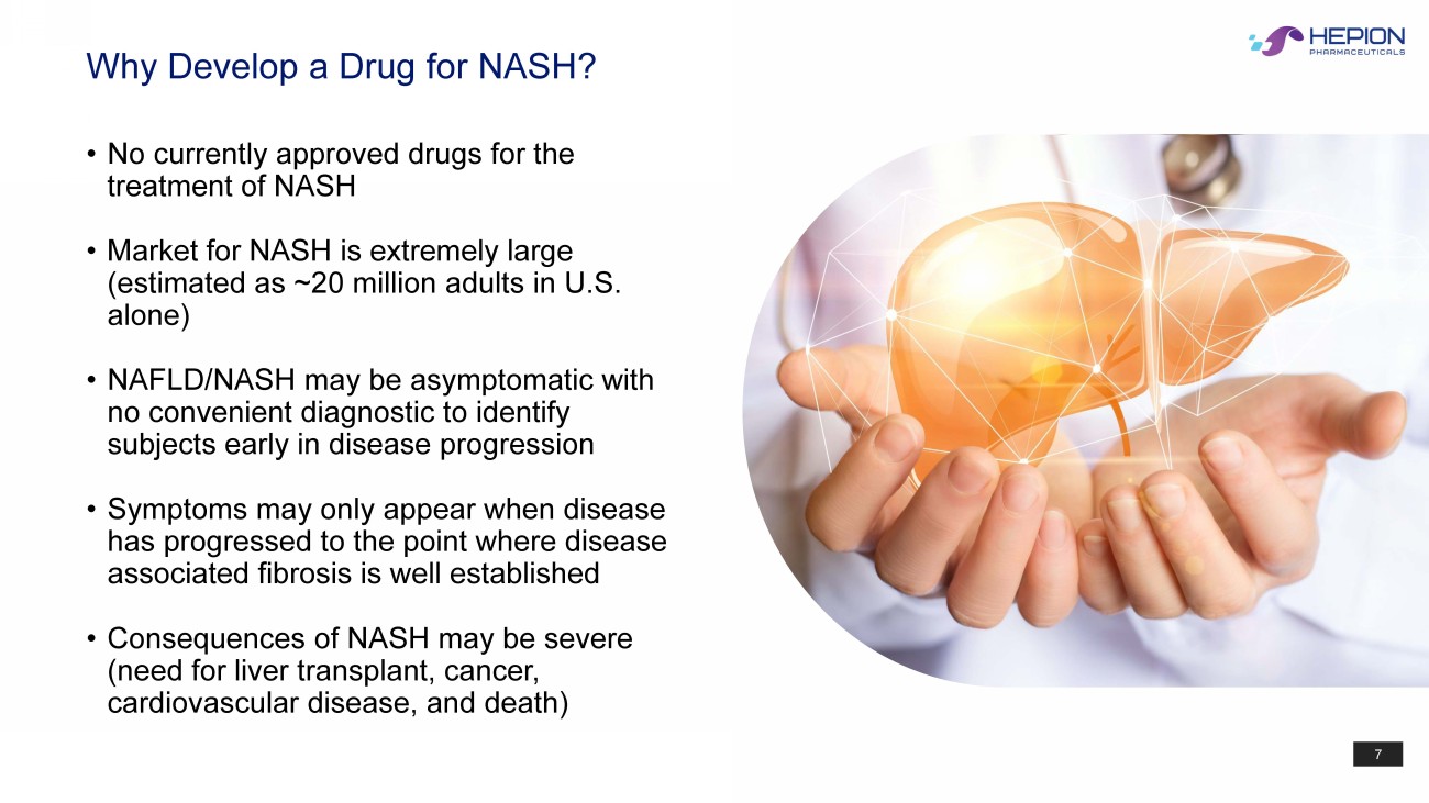 6 Image adapted from “From NASH to HCC: current concepts and future challenges”, Anstee et al. (2019) NASH is Driving a Healthcare Crisis The Need and Opportunity NAFLD n on - a lcoholic f atty l iver d isease Approx. 25% of global population Up to 100 million in U.S. “Fatty liver” disease associated with obesity, diabetes, hypertension, etc. 1.5 – 6.5% globally Approx. 20 million in U.S. A more severe form of NAFLD, with inflammation and liver scarring (fibrosis) NASH n on - a lcoholic s teato h ep atitis HCC h epato c ellular c arcinoma Most prevalent type (90%) of liver cancer & liver cancer is 2 most common cancer - related death* >905,000 new cases and >830,000 deaths globally* >30,000 new cases annually in U.S.* with 5 - year survival of 18%** *The Global Cancer Observatory (Globocan), December 2020 **UpToDate, February 2022