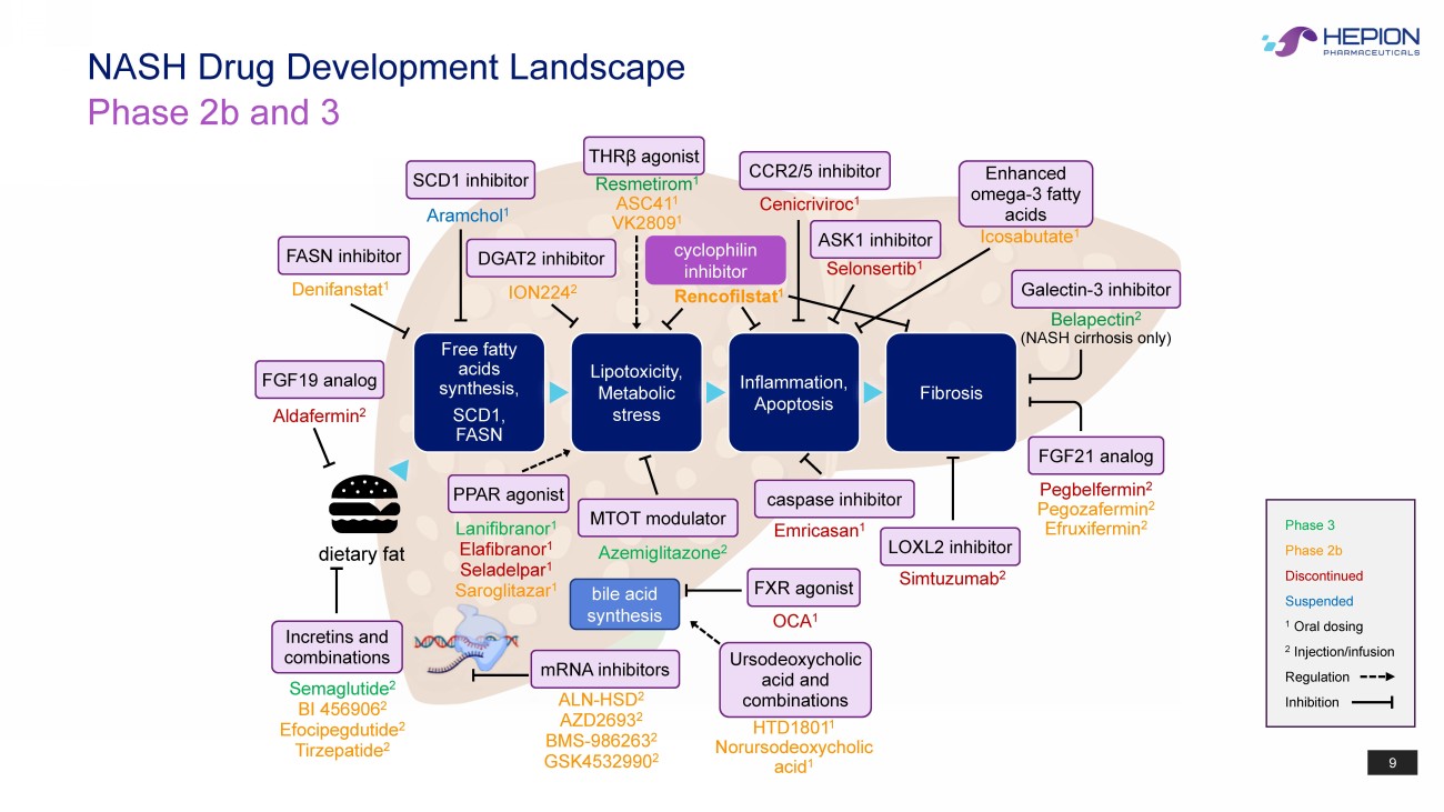 9 Phase 2b and 3 NASH Drug Development Landscape ASK1 inhibitor Galectin - 3 inhibitor LOXL2 inhibitor FASN inhibitor FXR agonist CCR2/5 inhibitor THR β agonist SCD1 inhibitor PPAR agonist FGF21 analog Pegbelfermin 2 Pegozafermin 2 Efruxifermin 2 Lanifibranor 1 Elafibranor 1 Seladelpar 1 Saroglitazar 1 Aramchol 1 Resmetirom 1 ASC41 1 VK2809 1 Cenicriviroc 1 Selonsertib 1 Rencofilstat 1 Belapectin 2 (NASH cirrhosis only) Denifanstat 1 Simtuzumab 2 OCA 1 bile acid synthesis cyclophilin inhibitor Phase 3 Phase 2b Discontinued Suspended 1 Oral dosing 2 Injection/infusion Regulation Inhibition Enhanced omega - 3 fatty acids Icosabutate 1 DGAT2 inhibitor ION224 2 FGF19 analog Aldafermin 2 Incretins and combinations Semaglutide 2 BI 456906 2 Efocipegdutide 2 Tirzepatide 2 mRNA inhibitors ALN - HSD 2 AZD2693 2 BMS - 986263 2 GSK4532990 2 Ursodeoxycholic acid and combinations HTD1801 1 Norursodeoxycholic acid 1 Free fatty acids synthesis, SCD1, FASN Lipotoxicity, Metabolic stress Inflammation, Apoptosis Fibrosis dietary fat caspase inhibitor Emricasan 1 MTOT modulator Azemiglitazone 2