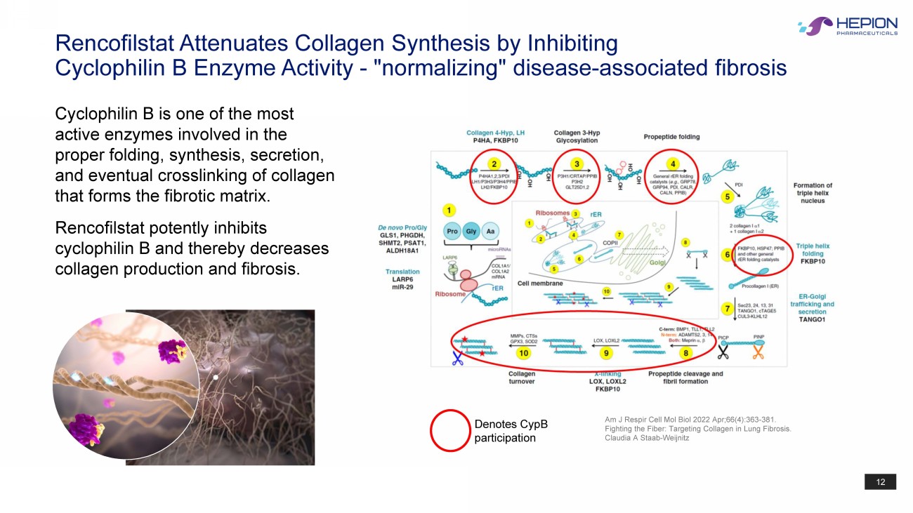 12 Rencofilstat Attenuates Collagen Synthesis by Inhibiting Cyclophilin B Enzyme Activity - "normalizing" disease - associated fibrosis Denotes CypB participation Am J Respir Cell Mol Biol 2022 Apr;66(4):363 - 381. Fighting the Fiber: Targeting Collagen in Lung Fibrosis. Claudia A Staab - Weijnitz Cyclophilin B is one of the most active enzymes involved in the proper folding, synthesis, secretion, and eventual crosslinking of collagen that forms the fibrotic matrix. Rencofilstat potently inhibits cyclophilin B and thereby decreases collagen production and fibrosis.