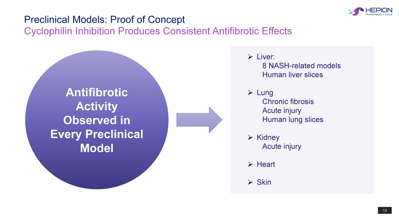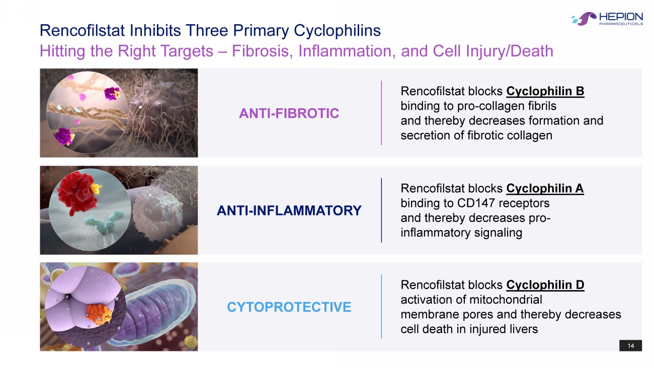 13 Cyclophilin Inhibition Produces Consistent Antifibrotic Effects Preclinical Models: Proof of Concept » Liver: 8 NASH - related models Human liver slices » Lung Chronic fibrosis Acute injury Human lung slices » Kidney Acute injury » Heart » Skin Antifibrotic Activity Observed in Every Preclinical Model
