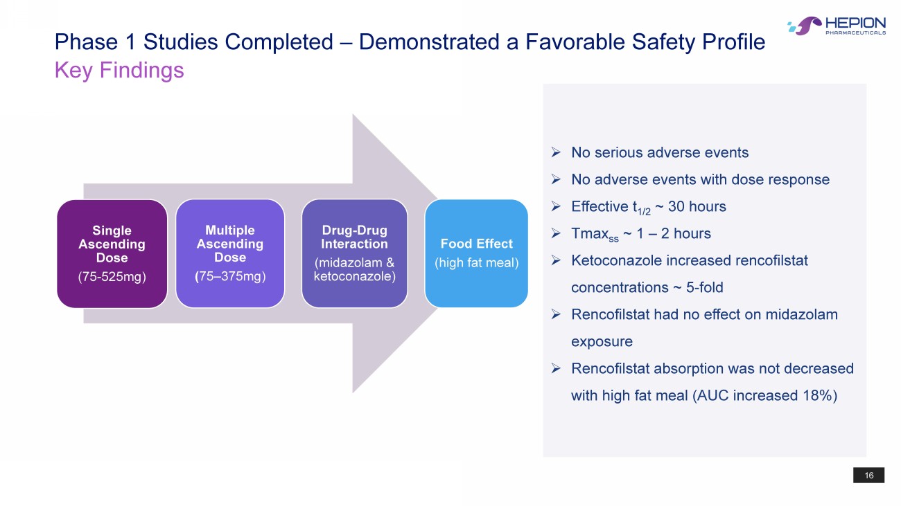16 Key Findings Phase 1 Studies Completed – D emonstrated a Favorable S afety P rofile » No serious adverse events » No adverse events with dose response » Effective t 1/2 ~ 30 hours » Tmax ss ~ 1 – 2 hours » Ketoconazole increased rencofilstat concentrations ~ 5 - fold » Rencofilstat had no effect on midazolam exposure » Rencofilstat absorption was not decreased with high fat meal (AUC increased 18%) Single Ascending Dose (75 - 525mg) Multiple Ascending Dose ( 75 – 375mg) Drug - Drug Interaction (midazolam & ketoconazole) Food Effect (high fat meal)