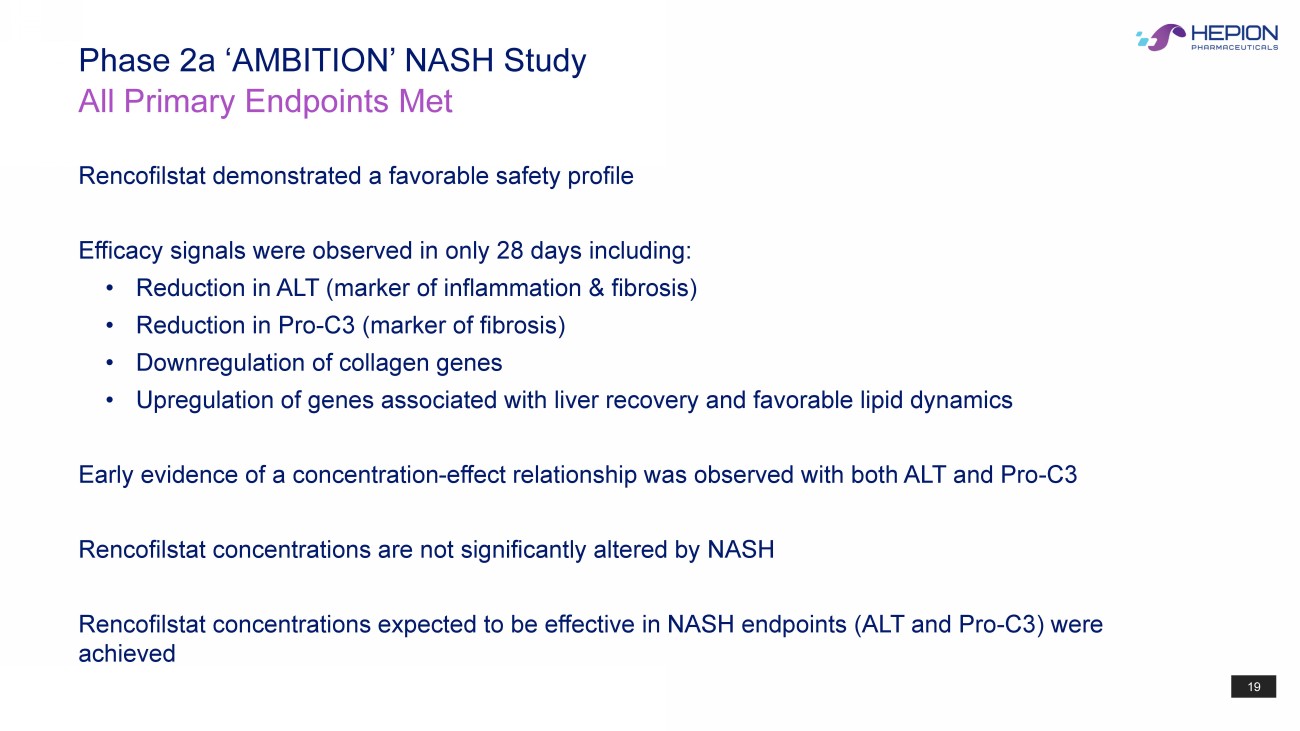 19 Rencofilstat demonstrated a favorable safety profile Efficacy signals were observed in only 28 days including: • Reduction in ALT (marker of inflammation & fibrosis) • Reduction in Pro - C3 (marker of fibrosis) • Downregulation of collagen genes • Upregulation of genes associated with liver recovery and favorable lipid dynamics Early evidence of a concentration - effect relationship was observed with both ALT and Pro - C3 Rencofilstat concentrations are not significantly altered by NASH Rencofilstat concentrations expected to be effective in NASH endpoints (ALT and Pro - C3) were achieved All Primary Endpoints Met Phase 2a ‘AMBITION’ NASH Study