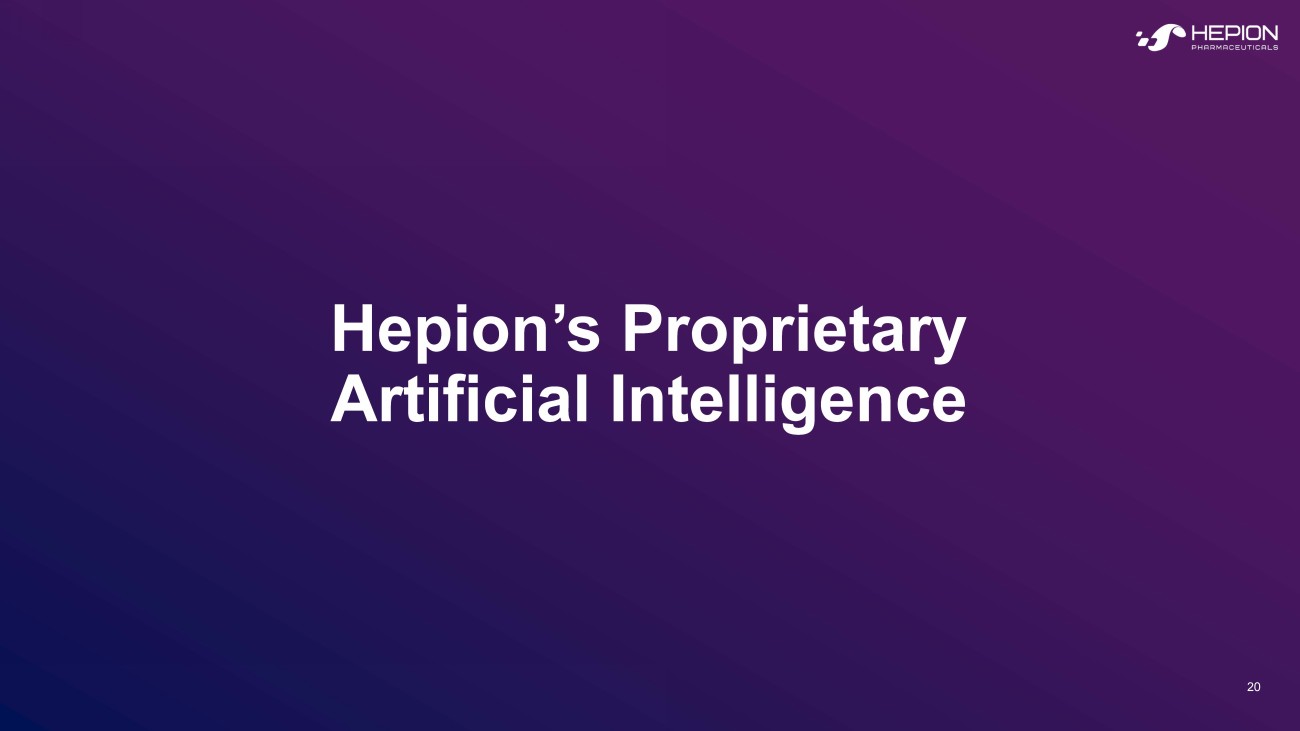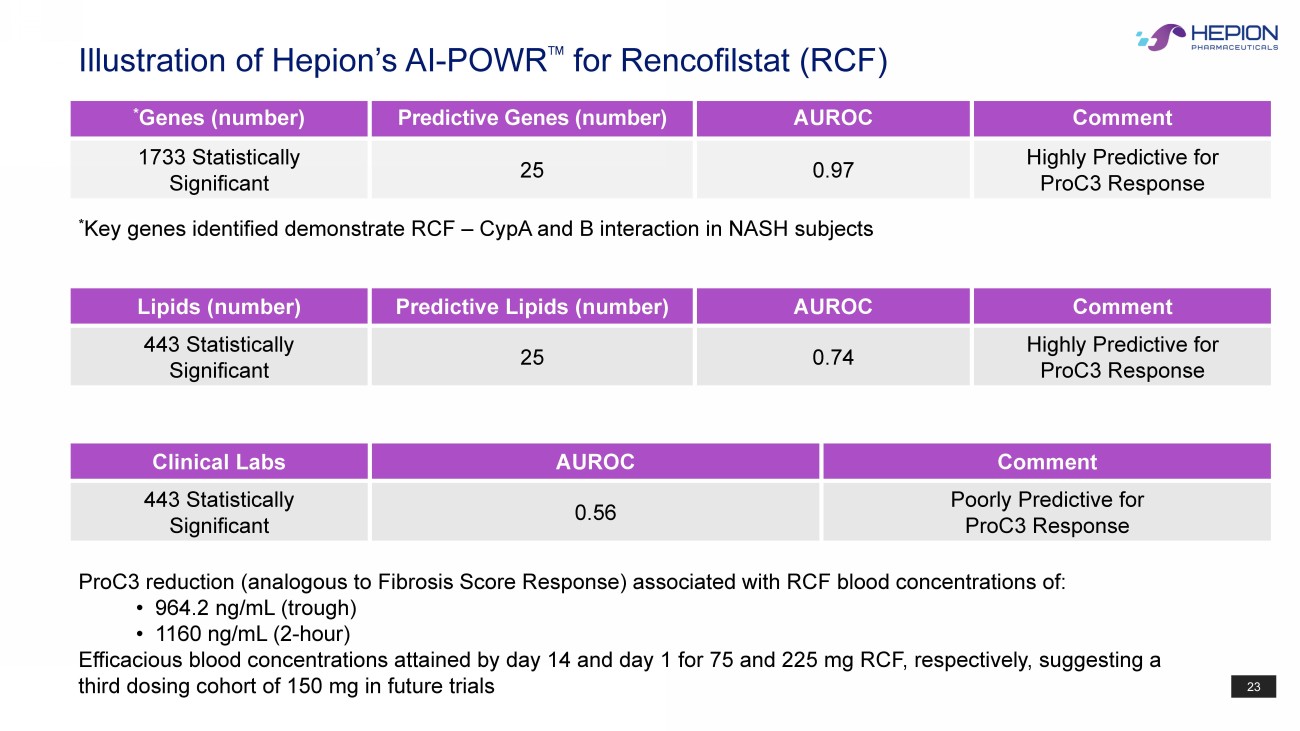 22 The Hepion AI - POWR Proprietary Clinical Process Pre - Clinical Data Informs AI/ML for Clinical Development • Biomarkers • Patient Selection • Simulation 1. AI/ML pop PKPD 2. AI/ML QSP 3. AI/ML PBPK AI - POWR PKPD/QSP/PBPK + Multi - omics + QoL + Safety + Deep Learning AI = Digital Biomarkers Responders • Responder Identification • Phase III Enrichment • Predict Clinical Outcome | | | | | | | | | | | | | Deep Learning Individual Response Model Drug - Disease Interaction Model • Digital Biomarkers • Eliminate Biopsy • Patient Specific Dosing • Clinical Monitoring • Reimbursement Identify New Therapeutics via Multi - Omic Data Base Mining Generate Synthetic Data for Patient & Outcome Simulation AI - POWR Œ Allows for Validation Comparisons 1. AI/ML included within developmental processes 2. AI/ML overarching input to outcome Preclinical Phase I Phase II Phase III Clinical Practice