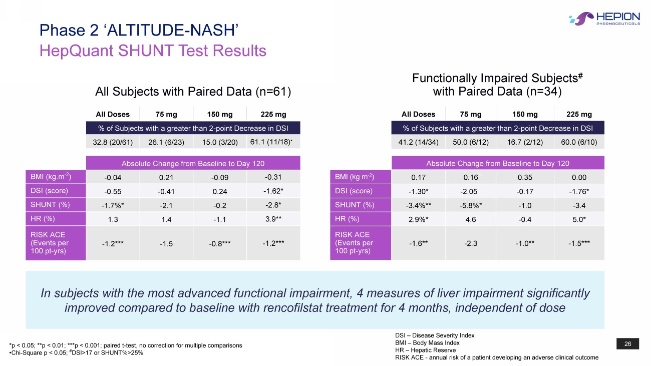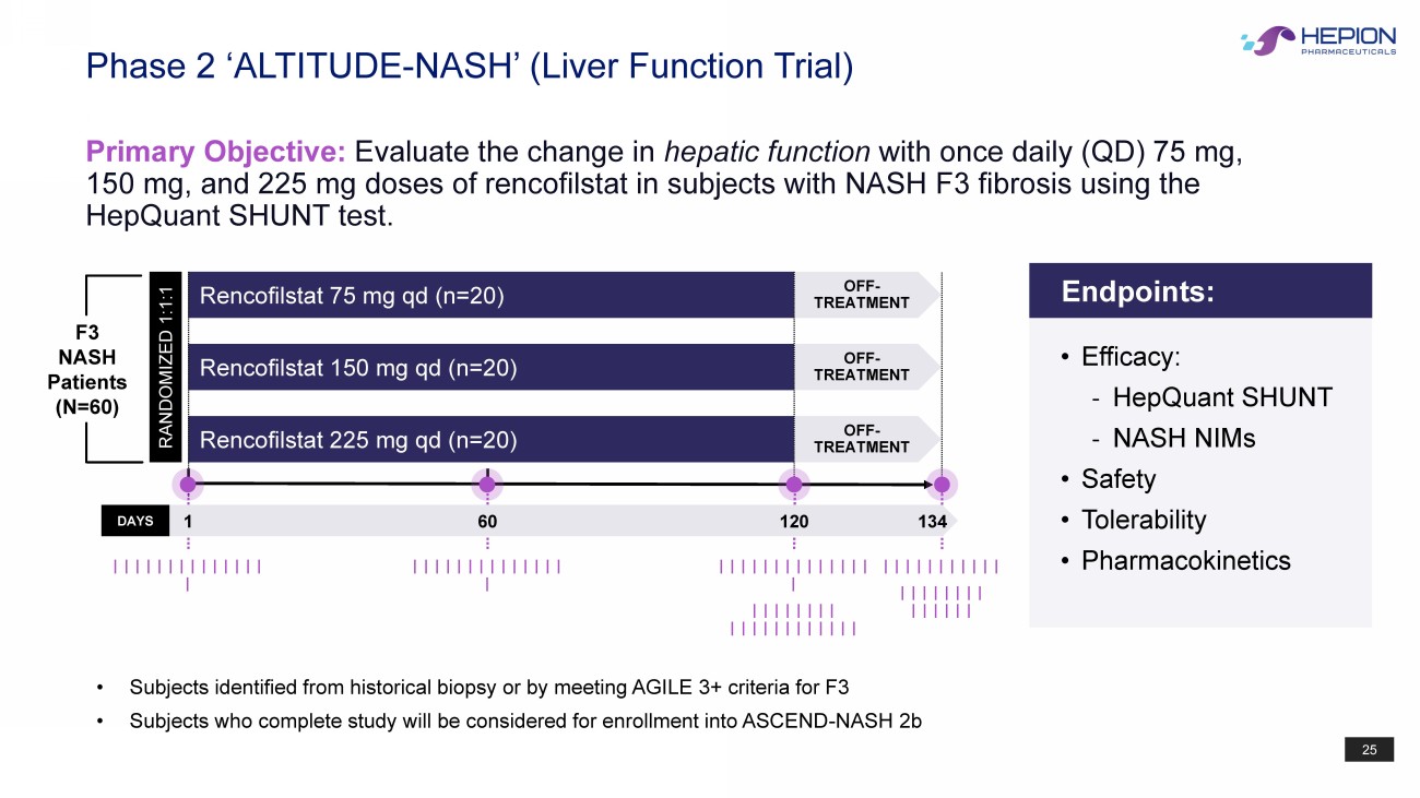 25 • Subjects identified from historical biopsy or by meeting AGILE 3+ criteria for F3 • Subjects who complete study will be considered for enrollment into ASCEND - NASH 2b Phase 2 ‘ALTITUDE - NASH’ (Liver Function Trial) Primary Objective: Evaluate the change in hepatic function with once daily (QD) 75 mg, 150 mg, and 225 mg doses of rencofilstat in subjects with NASH F3 fibrosis using the HepQuant SHUNT test. Rencofilstat 225 mg qd (n=20) Rencofilstat 75 mg qd (n=20) Rencofilstat 150 mg qd (n=20) RANDOMIZED 1:1:1 OFF - TREATMENT OFF - TREATMENT OFF - TREATMENT DAYS 1 120 134 | | | | | | | | | | | | | | | | | | | | | | | | | | | | | | | | | | | | | | | | | | | | | | | | | | | | | | | | | | | | | | | | | | | | | | | | | | | F3 NASH Patients (N=60) 60 | | | | | | | | | | | | | | | Endpoints: • Efficacy: - HepQuant SHUNT - NASH NIMs • Safety • Tolerability • Pharmacokinetics