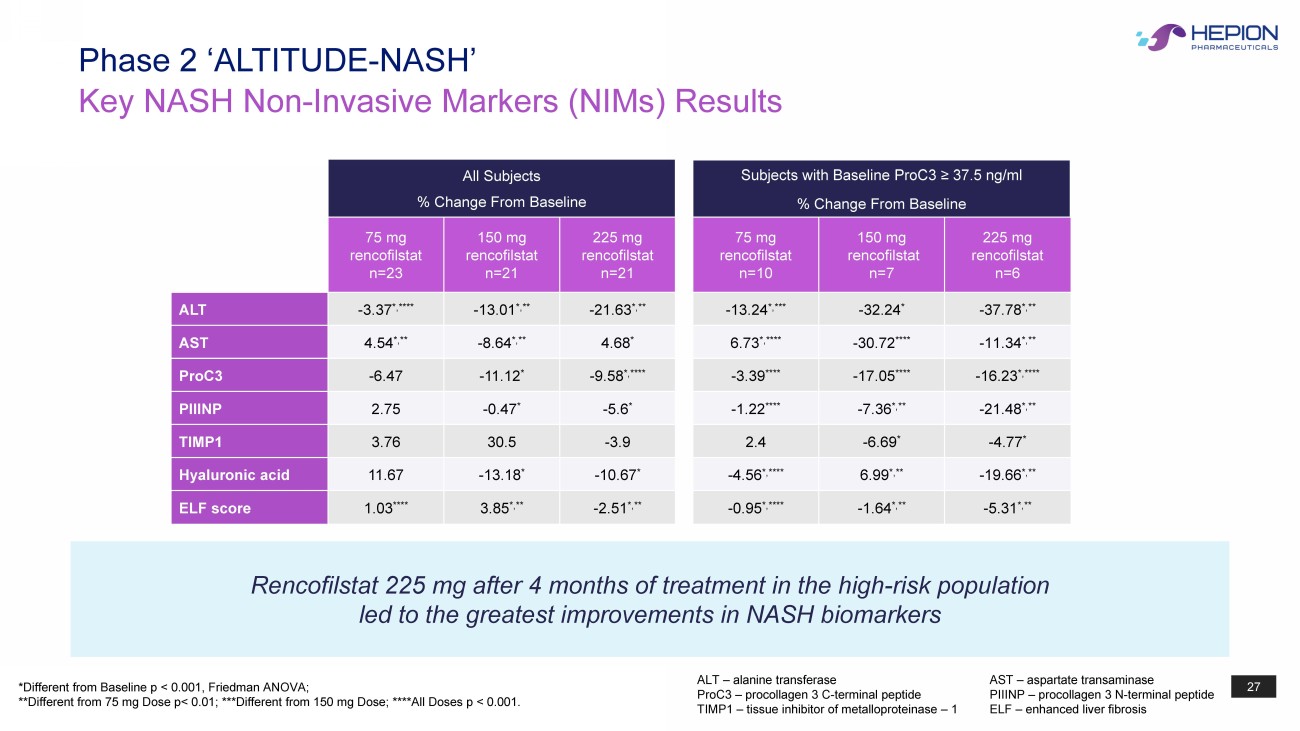 26 HepQuant SHUNT Test Results Phase 2 ‘ALTITUDE - NASH’ All Doses 75 mg 150 mg 225 mg % of Subjects with a greater than 2 - point Decrease in DSI 32.8 (20/61) 26.1 (6/23) 15.0 (3/20) 61.1 (11/18) • Absolute Change from Baseline to Day 120 BMI (kg.m - 2 ) - 0.04 0.21 - 0.09 - 0.31 DSI (score) - 0.55 - 0.41 0.24 - 1.62* SHUNT (%) - 1.7%* - 2.1 - 0.2 - 2.8* HR (%) 1.3 1.4 - 1.1 3.9** RISK ACE (Events per 100 pt - yrs ) - 1.2*** - 1.5 - 0.8*** - 1.2*** All Doses 75 mg 150 mg 225 mg % of Subjects with a greater than 2 - point Decrease in DSI 41.2 (14/34) 50.0 (6/12) 16.7 (2/12) 60.0 (6/10) Absolute Change from Baseline to Day 120 BMI (kg m - 2 ) 0.17 0.16 0.35 0.00 DSI (score) - 1.30* - 2.05 - 0.17 - 1.76* SHUNT (%) - 3.4%** - 5.8%* - 1.0 - 3.4 HR (%) 2.9%* 4.6 - 0.4 5.0* RISK ACE (Events per 100 pt - yrs ) - 1.6** - 2.3 - 1.0** - 1.5*** In subjects with the most advanced functional impairment, 4 measures of liver impairment significantly improved compared to baseline with rencofilstat treatment for 4 months, independent of dose *p < 0.05; **p < 0.01; ***p < 0.001; paired t - test, no correction for multiple comparisons •Chi - Square p < 0.05; # DSI>17 or SHUNT%>25% All Subjects with Paired Data (n=61) Functionally Impaired Subjects # with Paired Data (n=34) DSI – Disease Severity Index BMI – Body Mass Index HR – Hepatic Reserve RISK ACE - annual risk of a patient developing an adverse clinical outcome