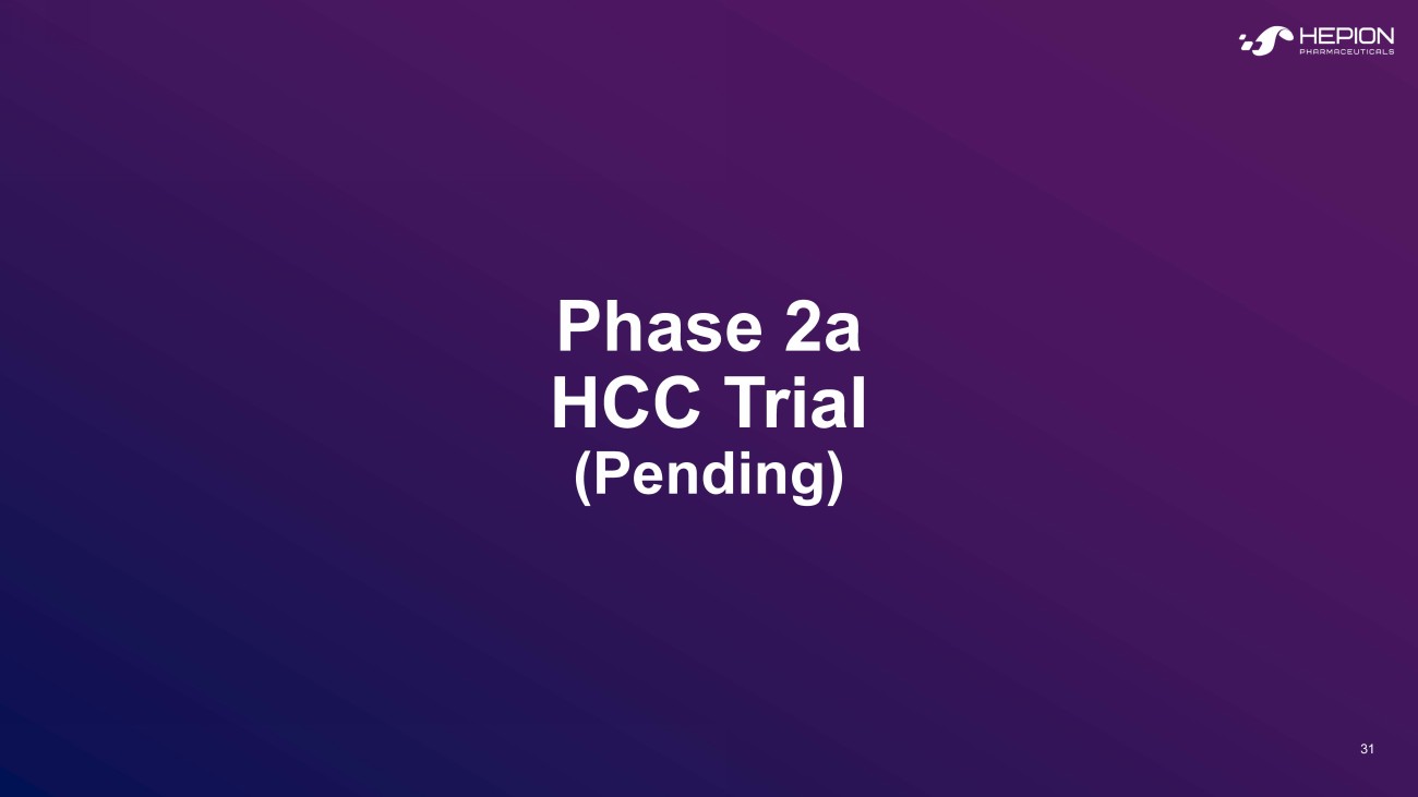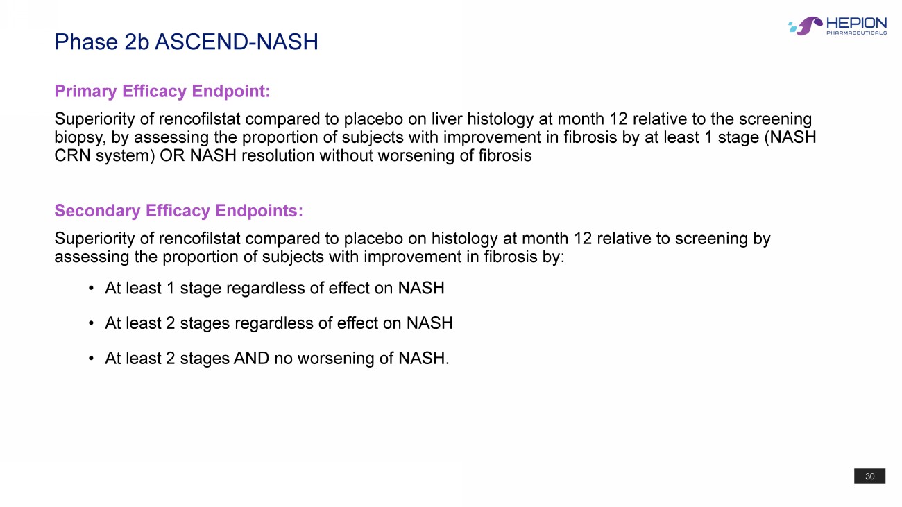 30 Phase 2b ASCEND - NASH Primary Efficacy Endpoint: Superiority of rencofilstat compared to placebo on liver histology at month 12 relative to the screening biopsy, by assessing the proportion of subjects with improvement in fibrosis by at least 1 stage (NASH CRN system) OR NASH resolution without worsening of fibrosis Secondary Efficacy Endpoints: Superiority of rencofilstat compared to placebo on histology at month 12 relative to screening by assessing the proportion of subjects with improvement in fibrosis by: • At least 1 stage regardless of effect on NASH • At least 2 stages regardless of effect on NASH • At least 2 stages AND no worsening of NASH.
