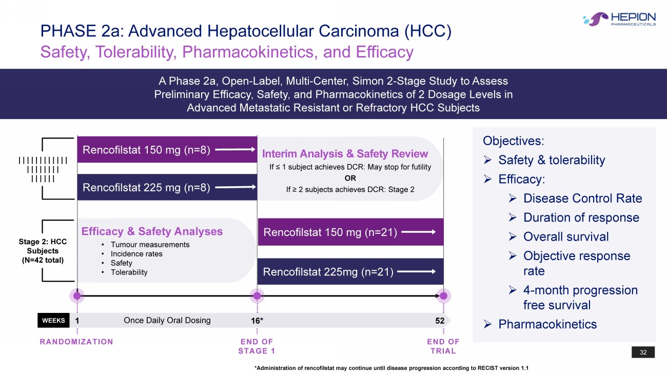 32 Objectives: » Safety & tolerability » Efficacy: » Disease Control Rate » Duration of response » Overall survival » Objective response rate » 4 - month progression free survival » Pharmacokinetics Safety, Tolerability, Pharmacokinetics, and Efficacy PHASE 2a: Advanced Hepatocellular Carcinoma (HCC) A Phase 2a, Open - Label, Multi - Center, Simon 2 - Stage Study to Assess Preliminary Efficacy, Safety, and Pharmacokinetics of 2 Dosage Levels in Advanced Metastatic Resistant or Refractory HCC Subjects *Administration of r encofilstat may continue until disease progression according to RECIST version 1.1 WEEKS 1 16* 52 END OF STAGE 1 END OF TRIAL RANDOMIZATION Once Daily Oral Dosing Efficacy & Safety Analyses • Tumour measurements • Incidence rates • Safety • Tolerability Rencofilstat 150 mg (n= 21 ) Rencofilstat 225mg (n=21) Stage 2: HCC Subjects (N=42 total) Interim Analysis & Safety Review If ≤ 1 subject achieves DCR: May stop for futility OR If ≥ 2 subjects achieves DCR: Stage 2 Rencofilstat 150 mg (n=8) Rencofilstat 225 mg (n= 8 ) | | | | | | | | | | | | | | | | | | | | | | | | | |