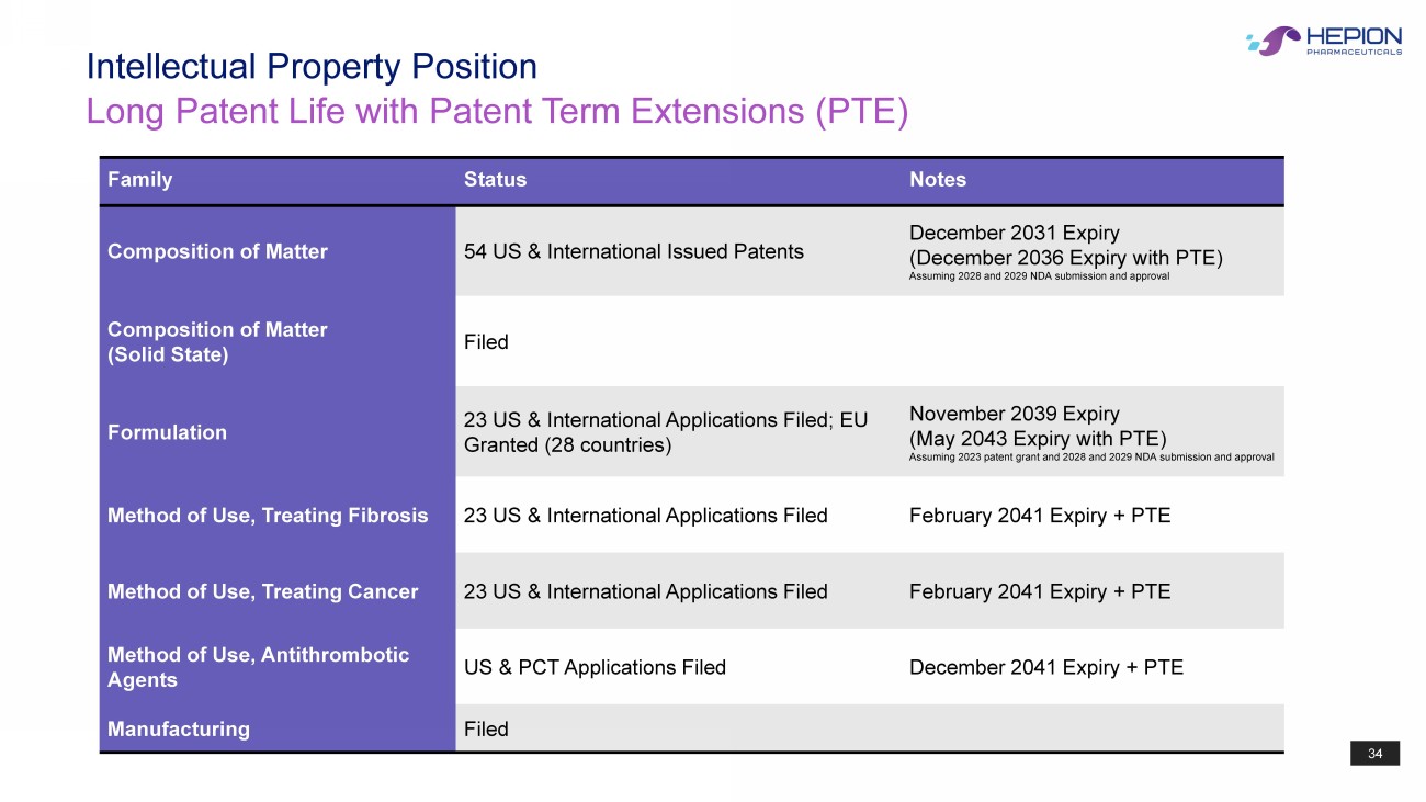 34 Long Patent Life with Patent Term Extensions (PTE) Intellectual Property Position Family Status Notes Composition of Matter 54 US & International Issued Patents December 2031 Expiry (December 2036 Expiry with PTE) Assuming 2028 and 2029 NDA submission and approval Composition of Matter (Solid State) Filed Formulation 23 US & International Applications Filed; EU Granted (28 countries) November 2039 Expiry (May 2043 Expiry with PTE) Assuming 2023 patent grant and 2028 and 2029 NDA submission and approval Method of Use, Treating Fibrosis 23 US & International Applications Filed February 2041 Expiry + PTE Method of Use, Treating Cancer 23 US & International Applications Filed February 2041 Expiry + PTE Method of Use, Antithrombotic Agents US & PCT Applications Filed December 2041 Expiry + PTE Manufacturing Filed