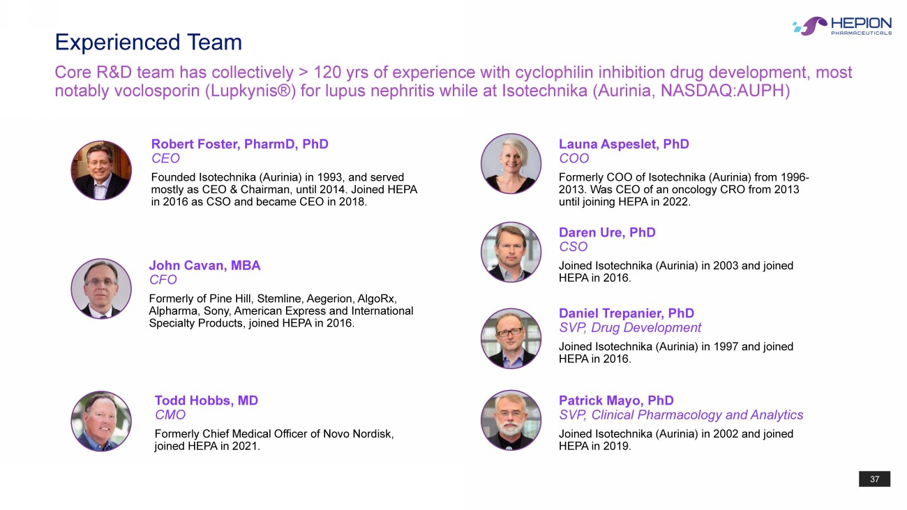 37 Patrick Mayo, PhD SVP, Clinical Pharmacology and Analytics Joined Isotechnika ( Aurinia ) in 2002 and joined HEPA in 2019. Robert Foster, PharmD, PhD CEO Founded Isotechnika ( Aurinia ) in 1993, and served mostly as CEO & Chairman, until 2014. Joined HEPA in 2016 as CSO and became CEO in 2018. John Cavan, MBA CFO Formerly of Pine Hill, Stemline , Aegerion, AlgoRx , Alpharma , Sony, American Express and International Specialty Products, joined HEPA in 2016. Todd Hobbs, MD CMO Formerly Chief Medical Officer of Novo Nordisk, joined HEPA in 2021. Launa Aspeslet , PhD COO Formerly COO of Isotechnika ( Aurinia ) from 1996 - 2013. Was CEO of an oncology CRO from 2013 until joining HEPA in 2022. Daren Ure , PhD CSO Joined Isotechnika ( Aurinia ) in 2003 and joined HEPA in 2016. Daniel Trepanier, PhD SVP, Drug Development Joined Isotechnika ( Aurinia ) in 1997 and joined HEPA in 2016. Core R&D team has collectively > 120 yrs of experience with cyclophilin inhibition drug development, most notably voclosporin ( Lupkynis ®) for lupus nephritis while at Isotechnika ( Aurinia , NASDAQ:AUPH) Experienced Team